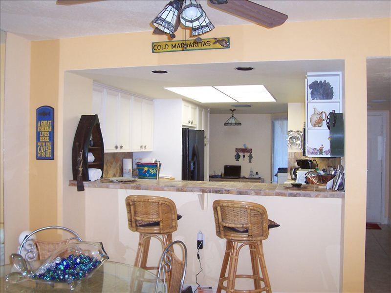 DEAL FOR JANUARY! Get away from the winter cold at a HUGE discount! Completely Rebuilt from the storm! Better than ever, come and enjoy our Paradise Found 2nd home. FREE BOAT DOCKAGE In the fishing capitol of the world, Islamorada. Beautifully furnished 2 BR 2 BA Condo on second floor.(First is parking only) Spiral Staircase directly down to grounds. Only this floor has the stairs, others have to go through a lobby with a key. The master bedroom and outside patio gives a beautiful view of the OCEAN. Wake up to the sunrise. Inside find a fully equipped kitchen, w/d, games, books comfortable furniture and smart TVs throughout. Even a pack-n-play for the baby. Go out into the mild weather and wander around among our beautiful tropical gardens, bring your drink down to the waters edge or curl up with a good book. Sandy beach boasts lounge chairs under Tiki huts and wonderful chaise lounges and tables around the pool. Fish or swim from the beautiful newly rebuilt T-dock with electric and water at each slip and another ice machine to stock your boat. A big cleaning station for your fresh catch. Most restaurants will cook it for you. Or just hang out and watch the fishermen come in. The work out center is fully equipped and even has a sauna! Don’t forget to Bring your boat or rent one at the numerous places nearby, FREE DOCKAGE!