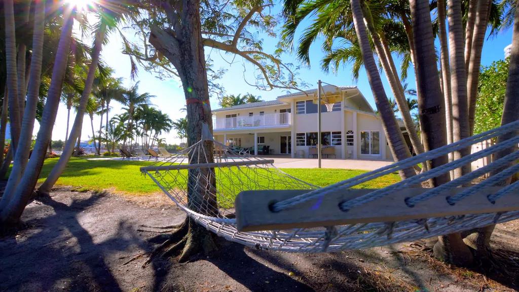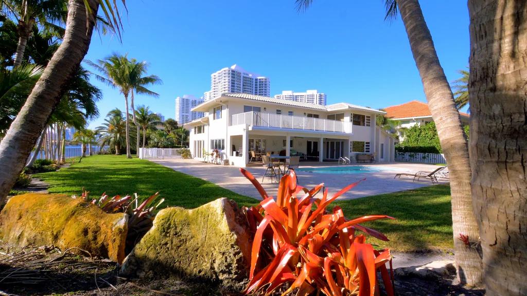 Kick back and watch the boats go by in this wrap-around intracoastal home on a near ½ acre point lot with 300 feet of sweeping water frontage. This elegant and comfortable 3800 sq. ft. two-story, four bedroom, three bath home with an in-ground heated pool, sits on a lush, tropical property surrounded by water with wide intracoastal views to the south, east and north. It is equidistant between South Beach (Miami Beach) and Fort Lauderdale. The property\'s entire perimeter is securely fenced for child safety. It accommodates 8 guests comfortably. Located in the exclusive Golden Isles boating community of Hallandale Beach, the home is conveniently located near beaches, nightlife, shopping, restaurants, casinos and other popular area attractions for kids and adults alike. This home offers you a unique “Holiday House”—make it your own private get away-- a comfortable place in a quiet upscale community to share time with friends and family for a memorable and relaxing stay.