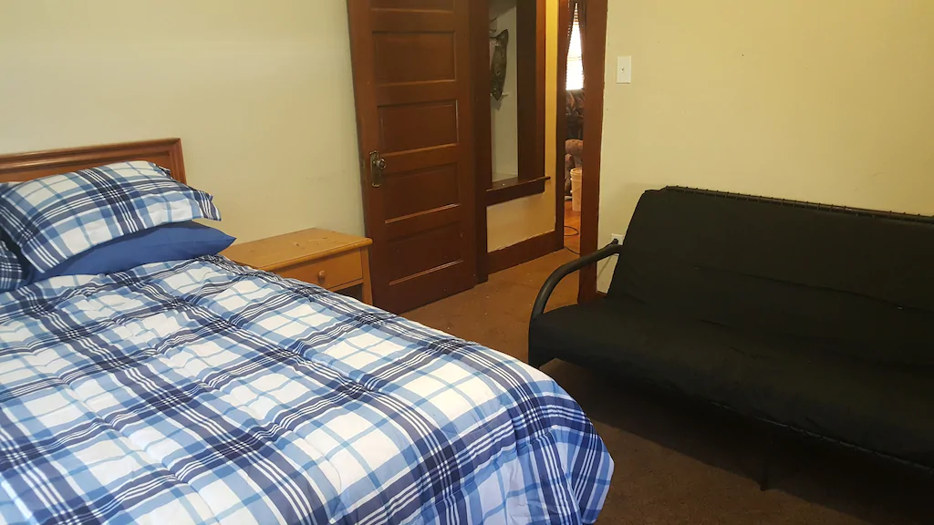 2 bedroom, 1 bath home with all the amenities close to downtown and swimming complex. Big screen TV with DirectTV programming and DVD player. Gas grill, ample parking, and front deck to relax on. There are 2 queen size beds, 2 full size futons as well as a sofa sleeper, couch, loveseat, recliner and plenty of floor space if you choose to have more guests. Easy walking distance to downtown nightclubs and nearby market.