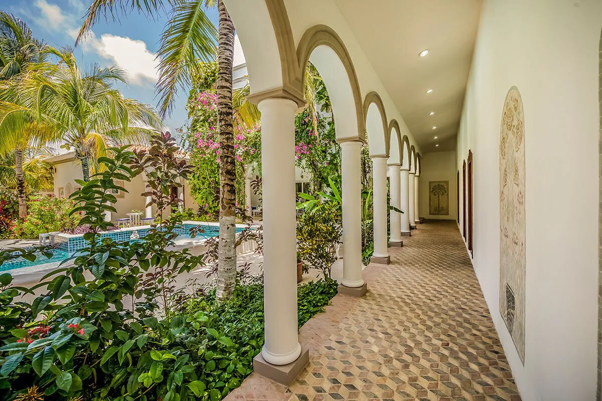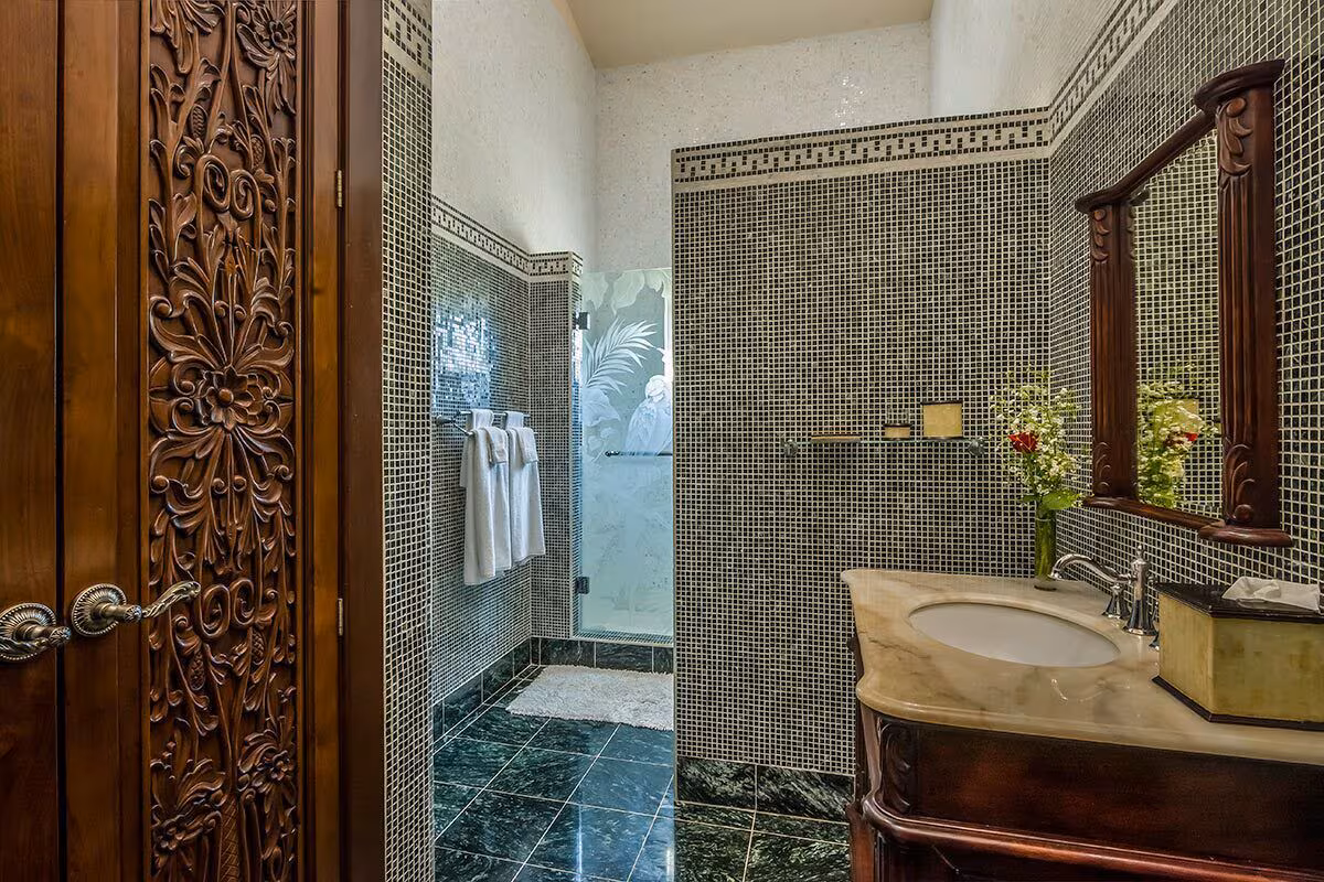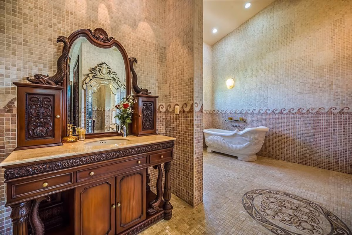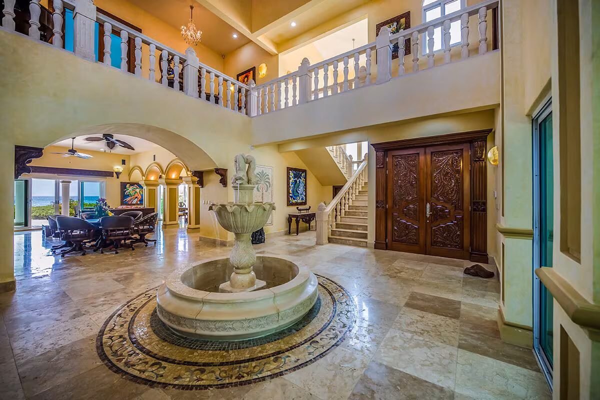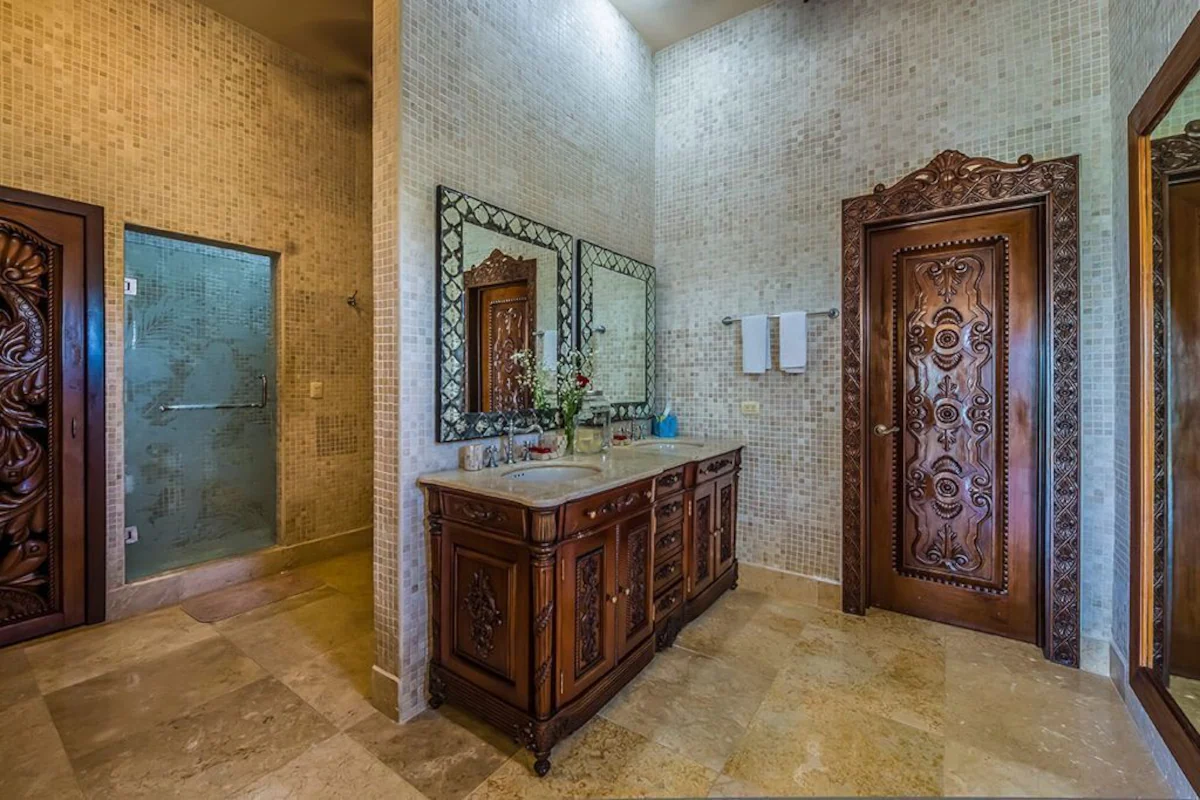 The exclusive custom made interiors and design of Casa Del Mar Bonito blend an eclectic variety of features including marble sculptures and fountains from Beijing, mosaic marble floors from Bali, hand carved mahogany doors from Indonesia and a conservatory brick domed ceiling completed by Mexican artisans. The pool tile was produced in Japan, and the glass shower doors hand etched in Java. The chef’s kitchen features state of the art appliances and granite counter tops.