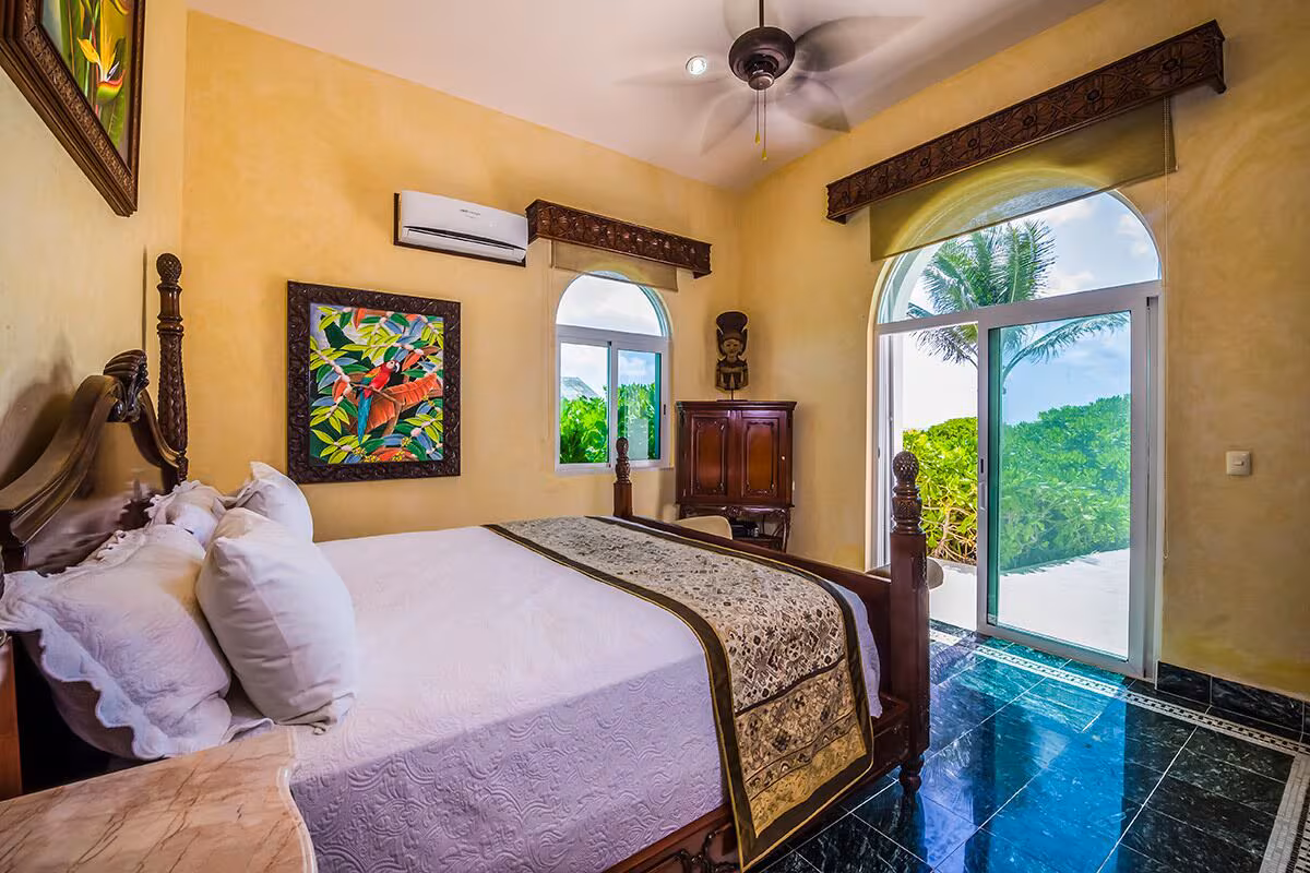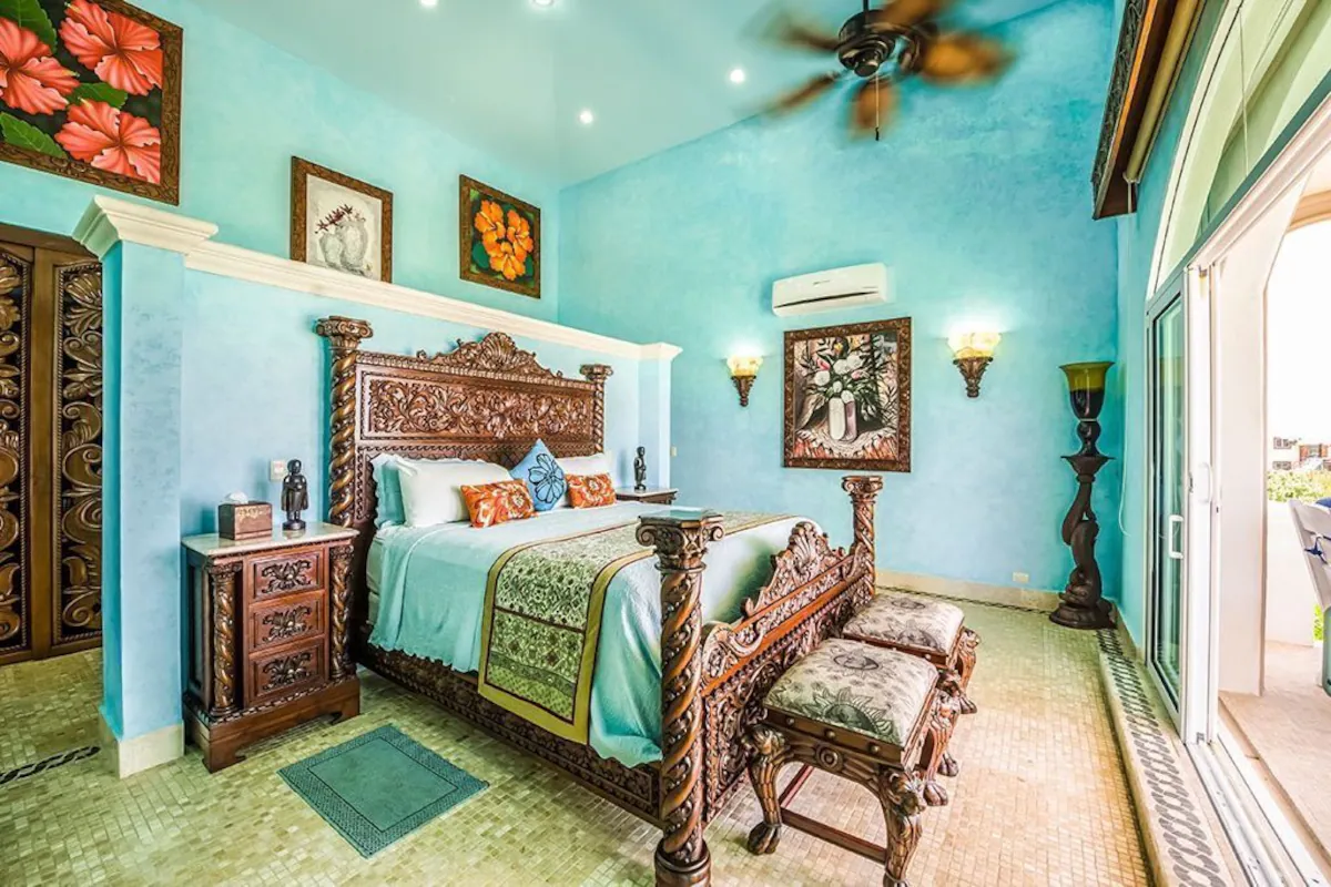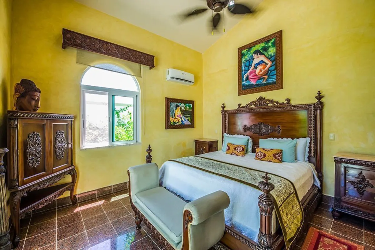 Four magnificent and stately bedrooms with sturdy and decorative wooden frames accommodate up to eight guests at Casa Del Mar Bonito. All of the bedrooms feature en-suite bathrooms and a rich variety of perks. The master suite takes up the entire second floor and is accessed via a marble stairway that leads to a balcony overlooking the conservatory floor. Additionally, the yoga room with its own ensuite bathroom and sauna has been converted to a bedroom, as has the office next to the upstairs masters bedroom.