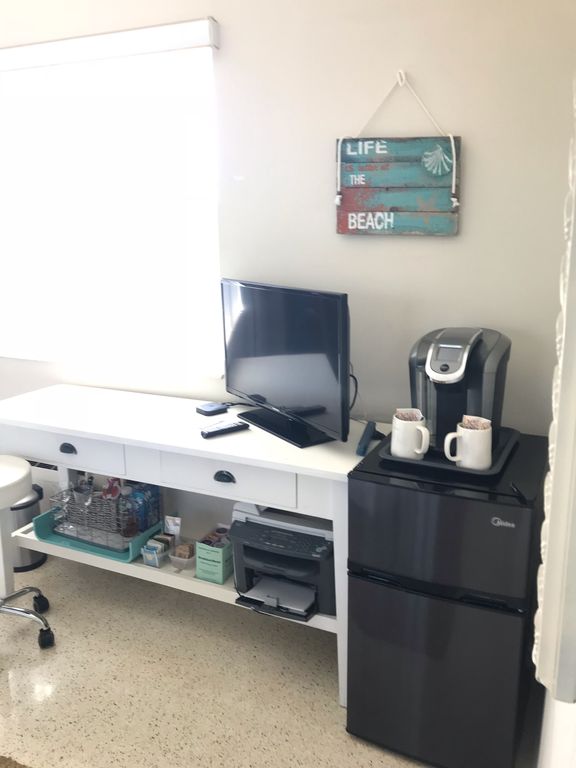 This hotel-like room has 27\" flat screen TV, free high speed wifi for streaming and working, AppleTV with unlimited media, work space with printer/copier, refrigerator, Keurig coffee maker with coffees and teas, iron, hair dryer, towels for beach and bath, and bath products.