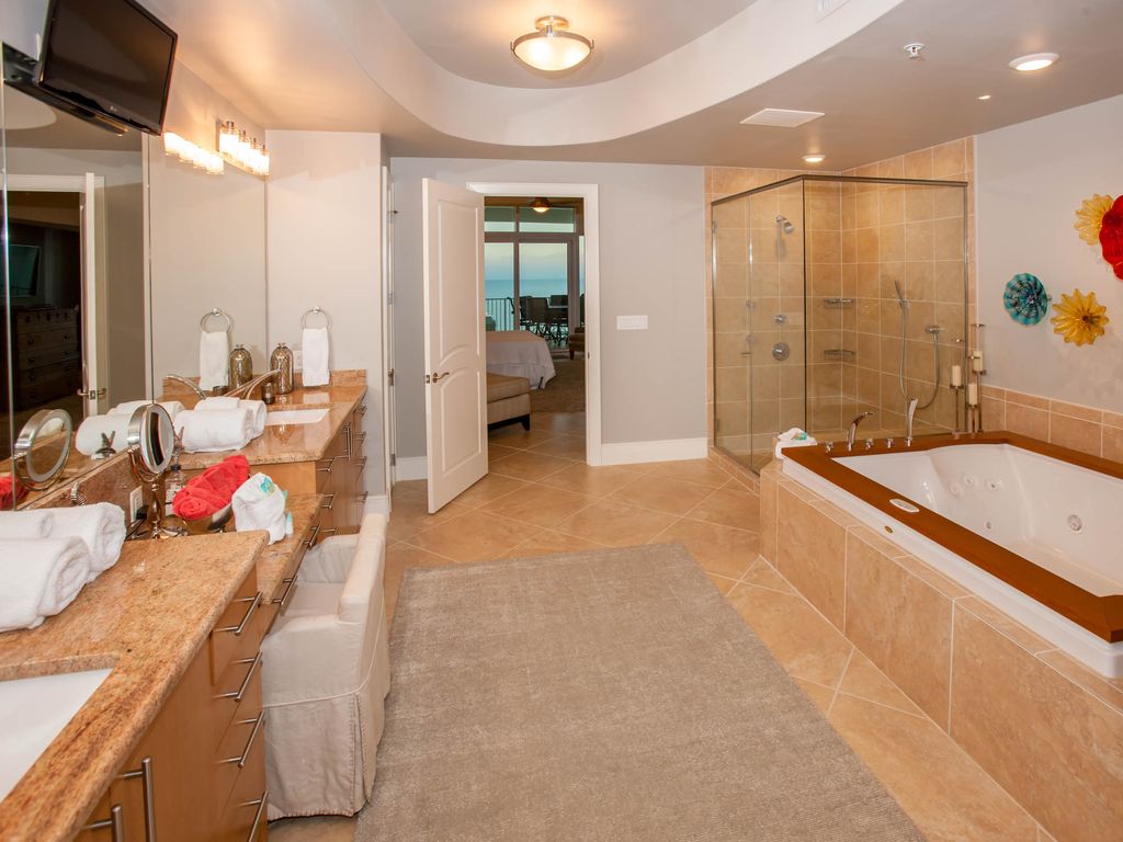 • Master Bedroom is fit for a king and queen!! Plenty of room with sitting area, desk, and all adjoins the most incredible master bath on the island! Gigantic Jacuzzi jetted and air jetted tub; his/her vanities; water closet with bidet; oversized walk in closet with access to the laundry room; flat screen HDTV; walk in shower with seat, jets, and sprayer.