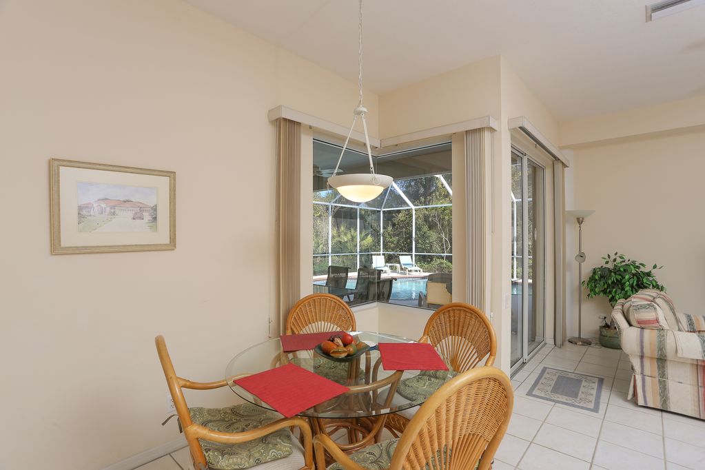 To the left is the master suite with king size bed light wood furniture, seating area and a private entrance to the pool area. This room features an en-suite bathroom with walk in shower, large tub with jacuzzi and double vanity and there is a large walk in closet. Desk with high speed internet access and bedroom tv. The casual family room has comfortable sofas with rattan furniture, large TV, VCR and music system. The kitchen overlooks the family room and is very spacious with all the modern conveniences. There is a casual breakfast area with table and chairs overlooking the pool area.