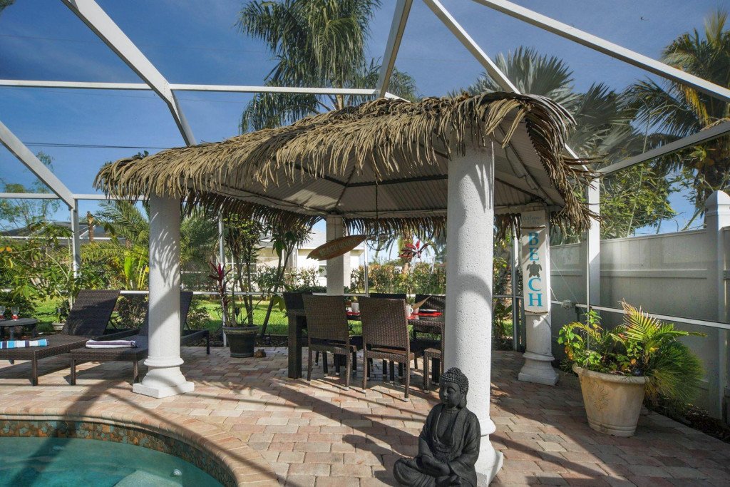A shady spot is also available under the Tiki hat by the pool.
