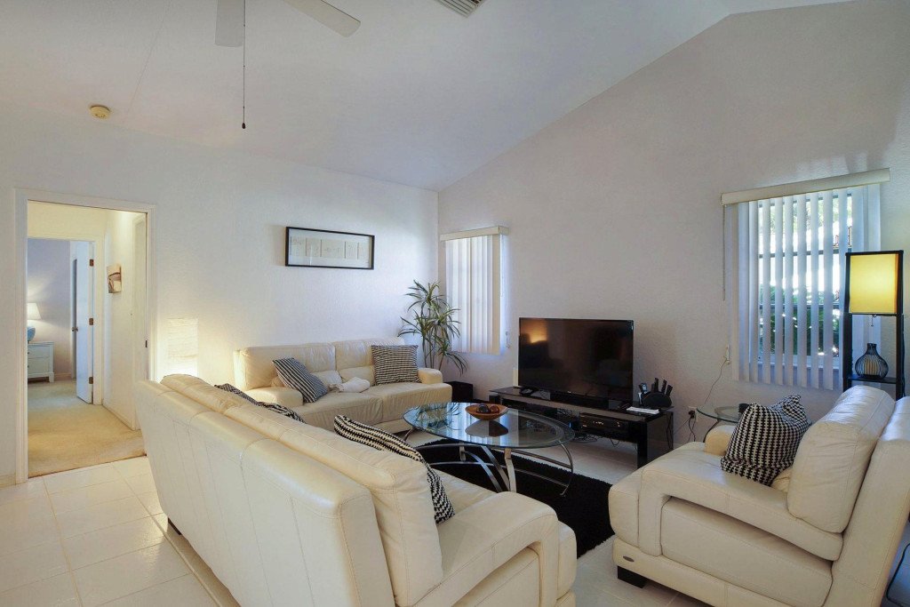The villa has a large living area with two sitting spaces, plus dining room, and a fully equipped kitchen with breakfast counter.