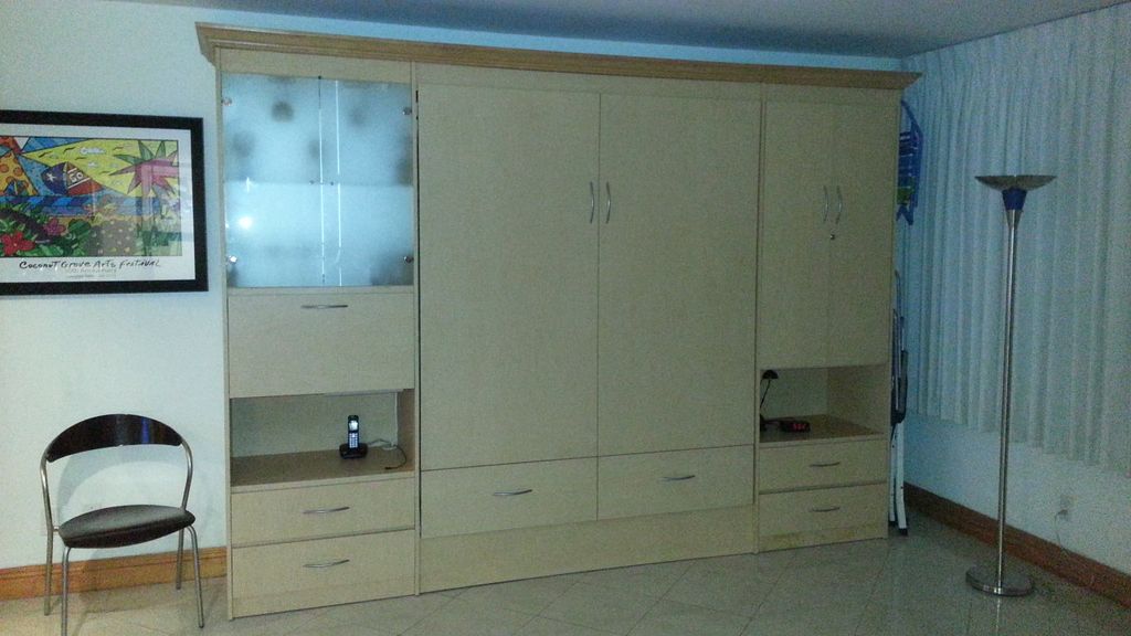 This condo was professionally designed and renovated to be a Modular, Space Efficient MICRO-APARTMENT. It is NOT a \"Junior 1 Bedroom\" which compromises both the living area and the bedroom. The design maintains the huge living area and connects it to a new Office/Library via French Doors. Because of modular design, at night, they can each convert to a private sleeping area. And, each sleeping area has it\'s own access to the 3 adjacent, smaller rooms which also serve multiple purposes. These include the Jacuzzi tub/shower and toilet room, the Vanity/dressing room, and the Walk-through Closet/dressing room. Both Sleeping areas utilize deluxe, queen size Murphy Beds hidden in full walls of custom cabinetry. The Home office includes a built-in library, desk, computer, printer/fax/copier/scanner. There are color TV sets with over 100 channels (with several pay channels such as HBO included) in each sleeping area. This condo has Porcelain floors throughout and Porcelain walls in the tub and vanity rooms. The huge living area includes a dining area with seating for up to 6, a Micro-kitchen with Refrigerator/freezer, Range, Microwave, Dishwasher and smart-storage cabinets, and there is a built-in bar in the Murphy bed cabinets. This condo also features: Large hurricane/sound proof windows facing south with ocean views; High-quality, \'total dark\' drapes which allow daytime siestas. Storage includes the walk-through closet with \'smart organizers,\' built-in wardrobe closet, two built-in dressers, one freestanding dresser, and a kitchen service buffet.