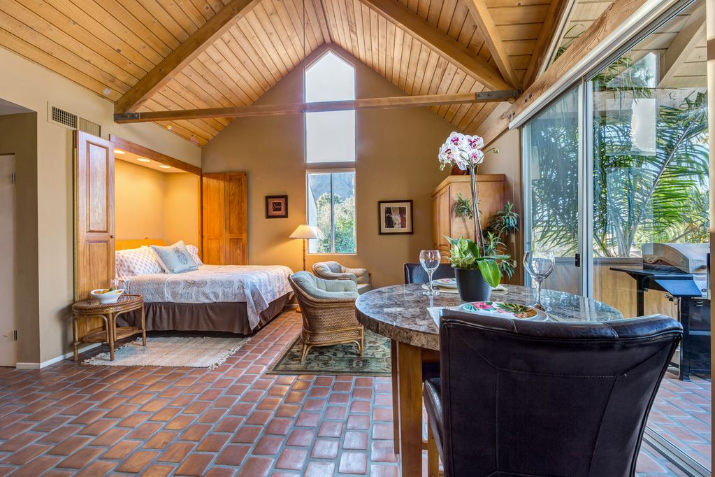 “The Caddie” ― Guests will enjoy the vaulted ceilings in this open floor plan studio. The remodeled kitchen features upgraded finishes with a convenient breakfast bar that seats two. The sleeping area offers a queen-size bed with overhead reading lights and a sitting area. There is one bathroom with a walk-in shower and upgraded finishes. The living room offers a flat screen hdtv. The small eating area and airy living room open with sliding glass doors to a large, private, covered deck, surrounded by palm trees, with mountain views. The deck features a gas barbecue, dining table & four chairs. This property is located just steps from the pool.