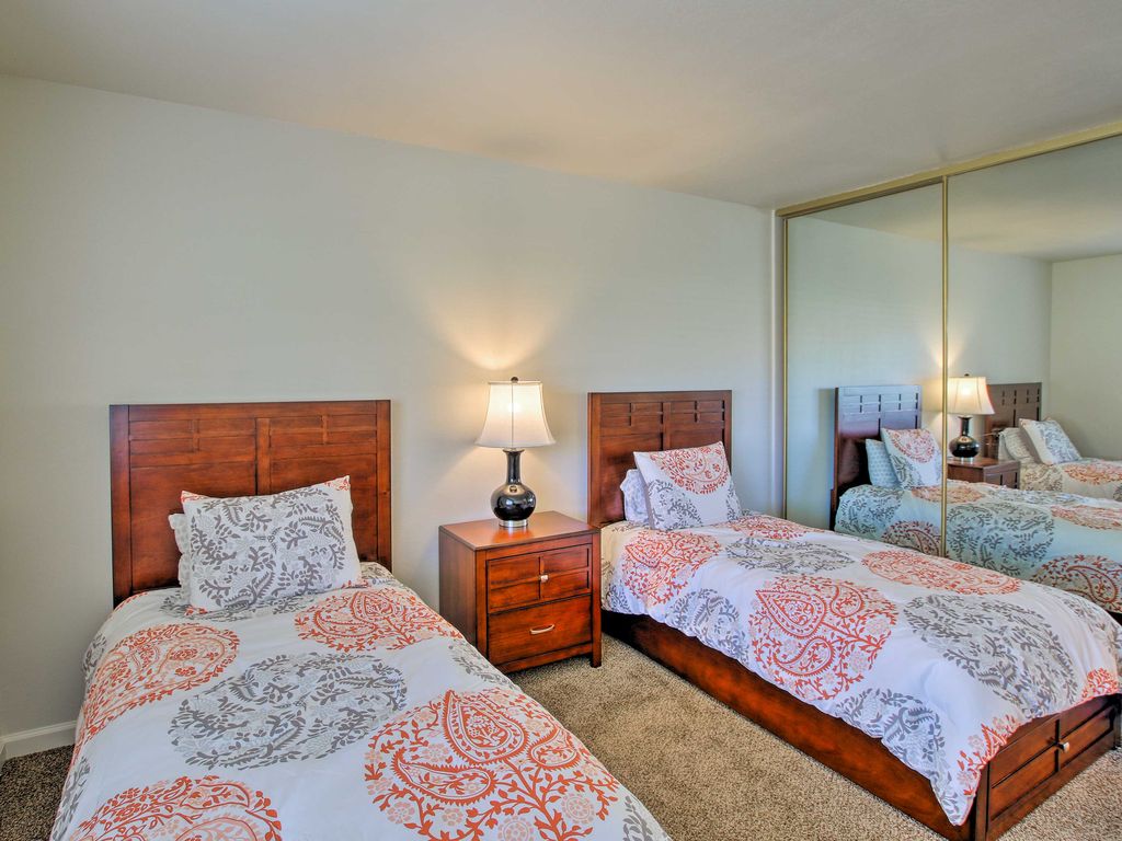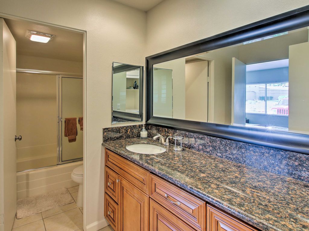 Step inside to the well furnished and cheery living area, with large flat-screen TV, and a cooling ceiling fan over the dining area. Prepare meals in the fully equipped kitchen with new stainless steel appliances, granite countertops, and tile backsplash.