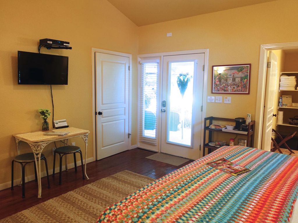 The \'Juniper Room\' at the Comal Inn is nestled in a quiet neighborhood in the heart of New Braunfels, Texas. Located across the street from the beautiful spring-fed Comal River and walking distance to the historic downtown Main Plaza and the world famous Schlitterbahn Water Park. Minutes away by car to Gruene, TX, home of Gruene Hall, the oldest dance hall in Texas. The Juniper Room sleeps up to 4 people, has pine floors, small microwave and refrigerator, coffee maker, cable TV, DVD player, alarm clock/radio, hairdryer, Wifi, BBQ grill, private porch with comfortable chairs to sit and relax in and a small table with chairs to eat and have your morning coffee. Breakfast - 1st morning only, homemade pastry/bread, fresh fruit, yogurt, orange juice, coffee, bottled water.