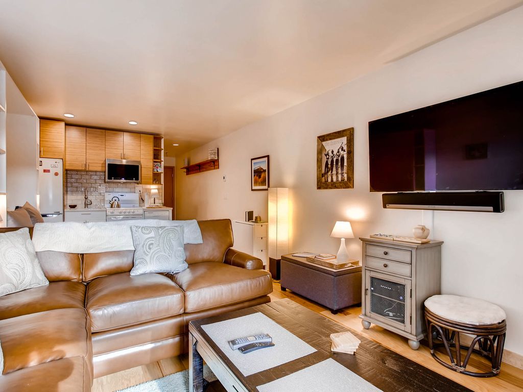 You’ll be pleasantly surprised with how nice this condo is. It’s cozy with comfortable and new furniture. The living area has a leather couch that has a double sleeper sofa hidden away. The large LCD TV with soundbar is great for watching the game or your favorite shows and the wood fireplace is a great touch that makes you feel like you’re in the mountains. A large sliding glass door provides plenty of natural light and leads to a balcony with superb views of Mount Royal and Tenmile Peak.