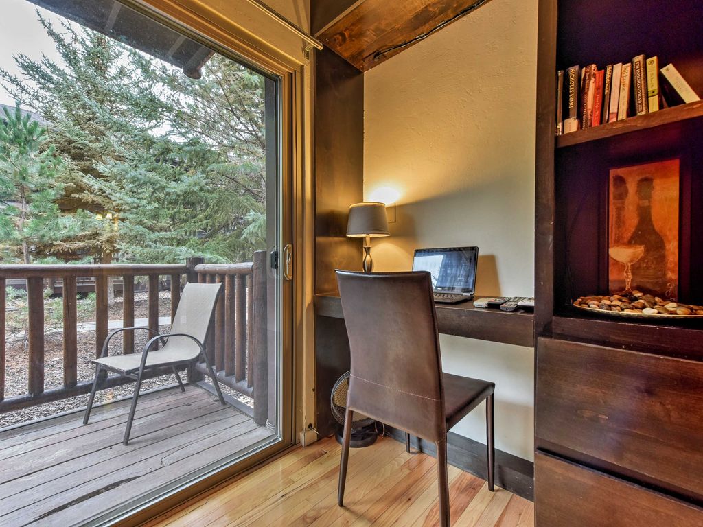 A built-in desk next to the fireplace offers a peaceful work space should you need to address any business while away or book a dinner reservation in town.