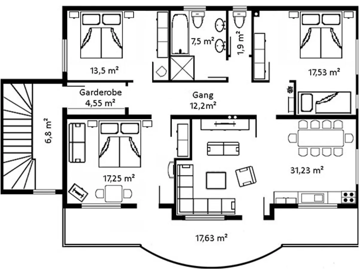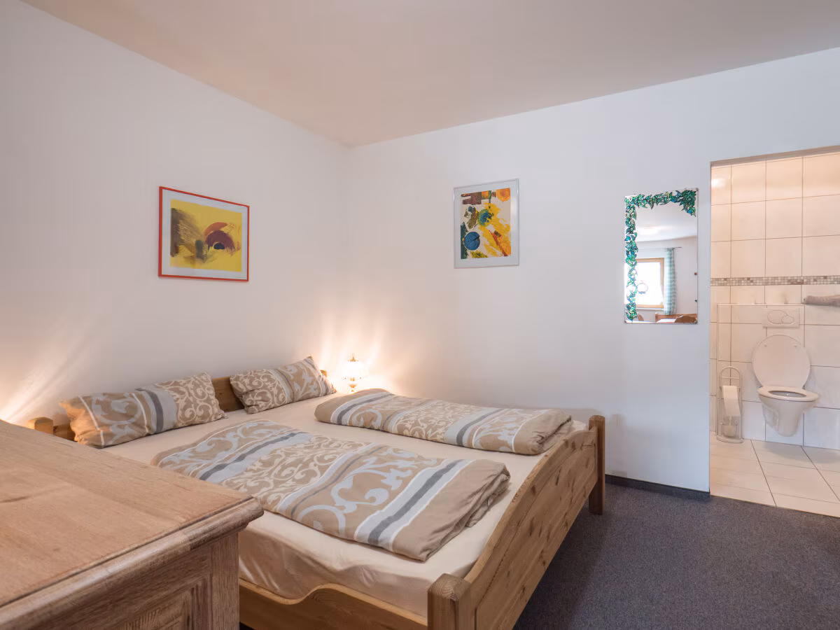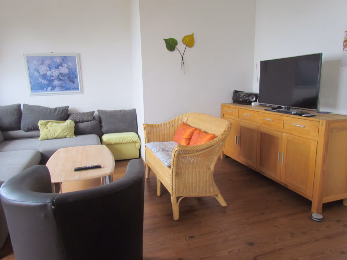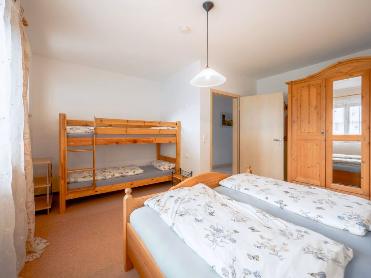 The holiday apartment has 3 fully furnished bedrooms: 1 room with a double bed, 1 room with a double bed and bunk bed and 1 room with a double bed and single bed. A child\'s bed can also be set up here. The bathroom is spacious. There is a bathtub, shower, toilet and 2 sinks. There is also a second separate toilet.