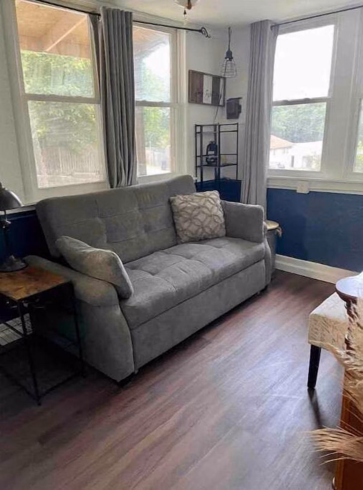 South Ave Cottage has a loft like bedroom upstairs with a hatched floor door for privacy. The upstairs has a queen sized bed and a twin futon with black out curtains. Downstairs is a cozy living room area with a Serta couch that can turn into a queen sized bed and extra linens are located in the milking bins. Also on the main floor is the kitchen, bathroom and office area.