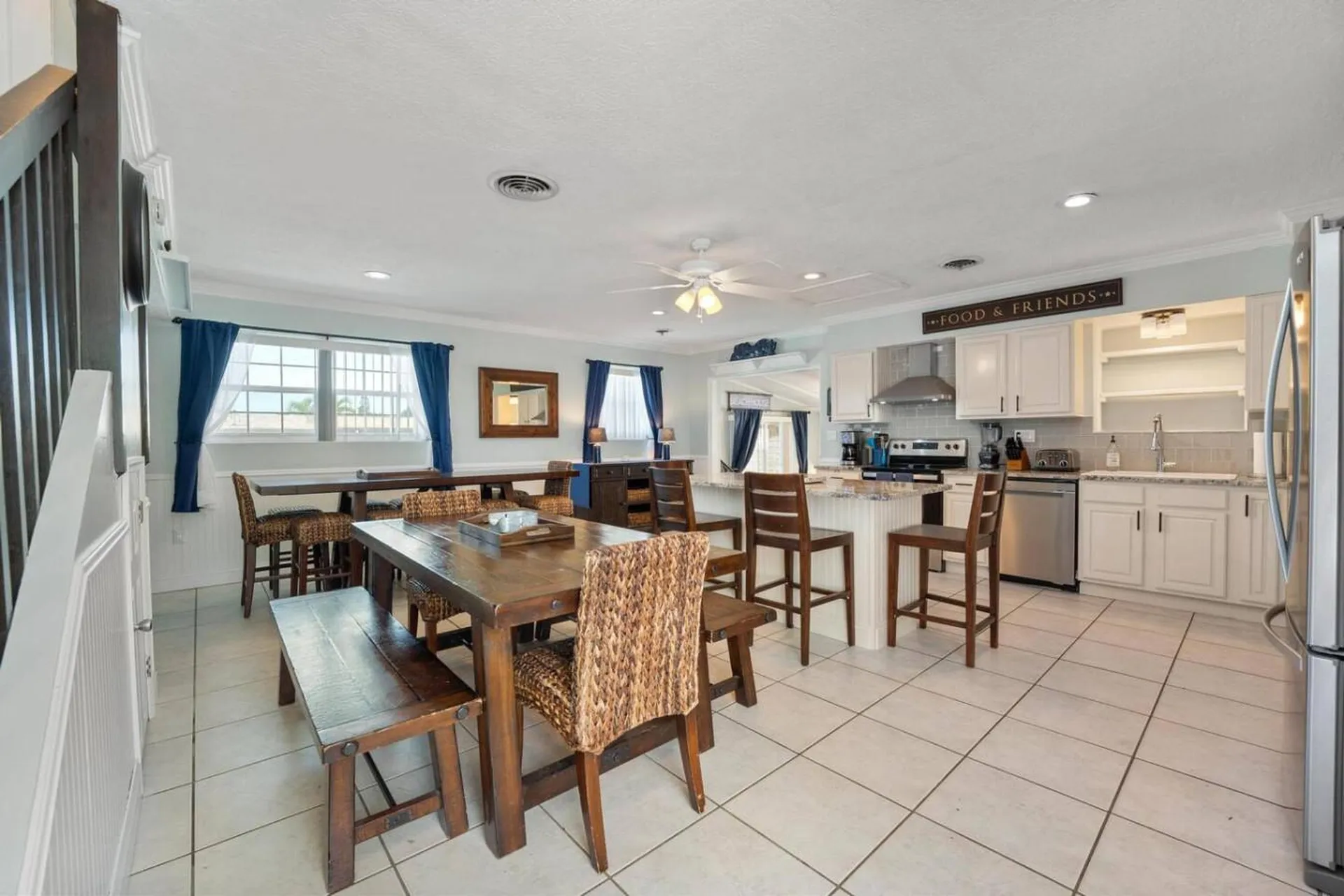 Unwind and lounge at the house comfortably: large heated pool, warm and relaxing hot tub, and a large tiki bar where you can sit in the shade and sip a cocktail. Big TV in the living room, TV's in every bedroom, and great air conditioning make for a comfortable beach house. There is a large dining area that has multiple options for seating (up to 20), whether you want a big family meal at the big dining room table, a snack at the kitchen island or something in between like a lunch for all the kids at the medium-sized dining table.
