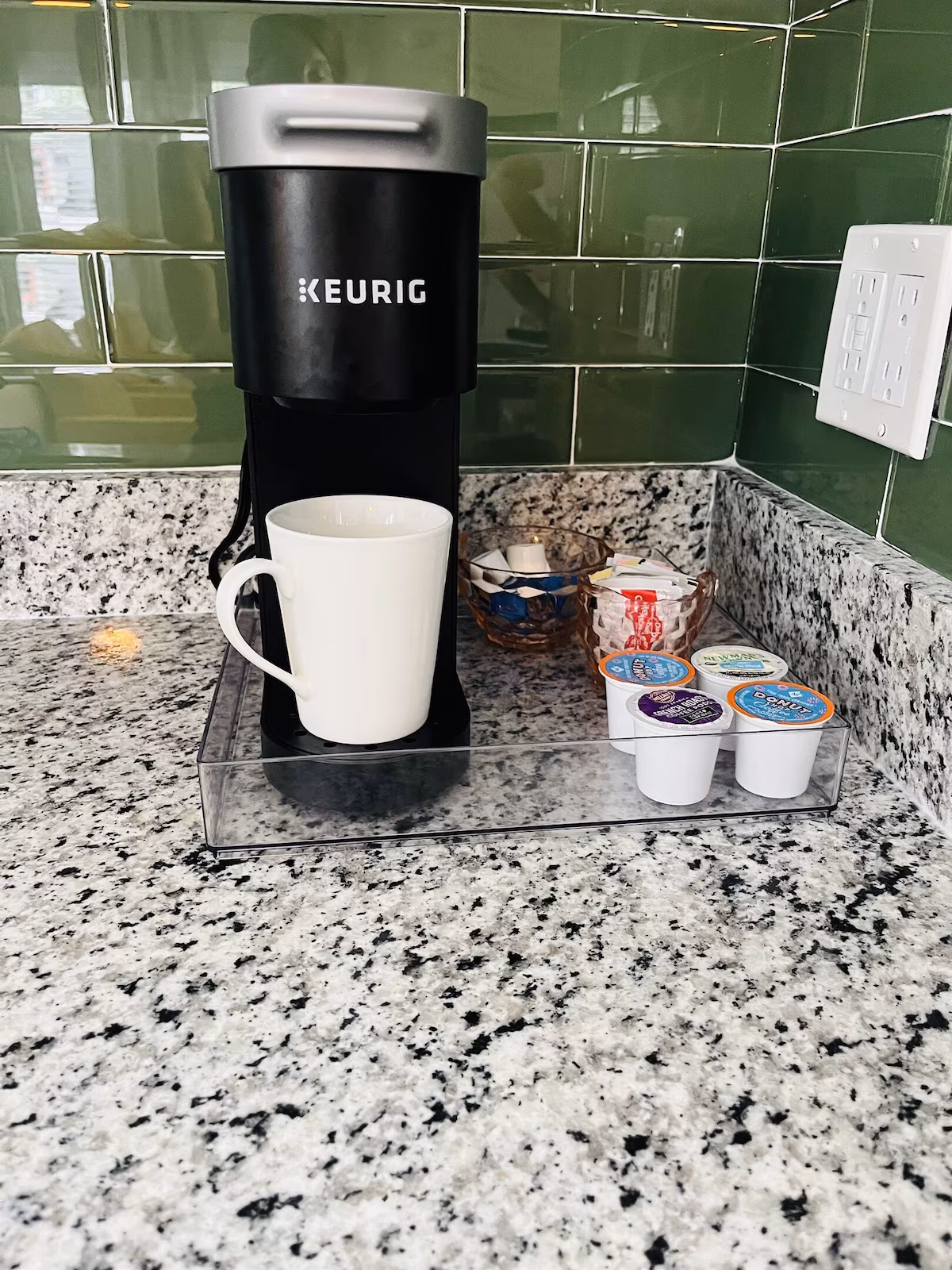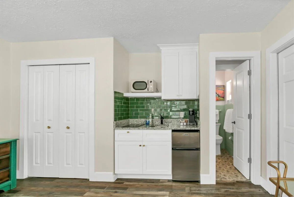 Adjacent to the living area, you\'ll find a well-equipped kitchenette complete with modern appliances, including a mini-fridge, microwave, toaster oven, and coffee maker. Whip up a quick breakfast or prepare a light meal to enjoy at the cozy dining table for two.