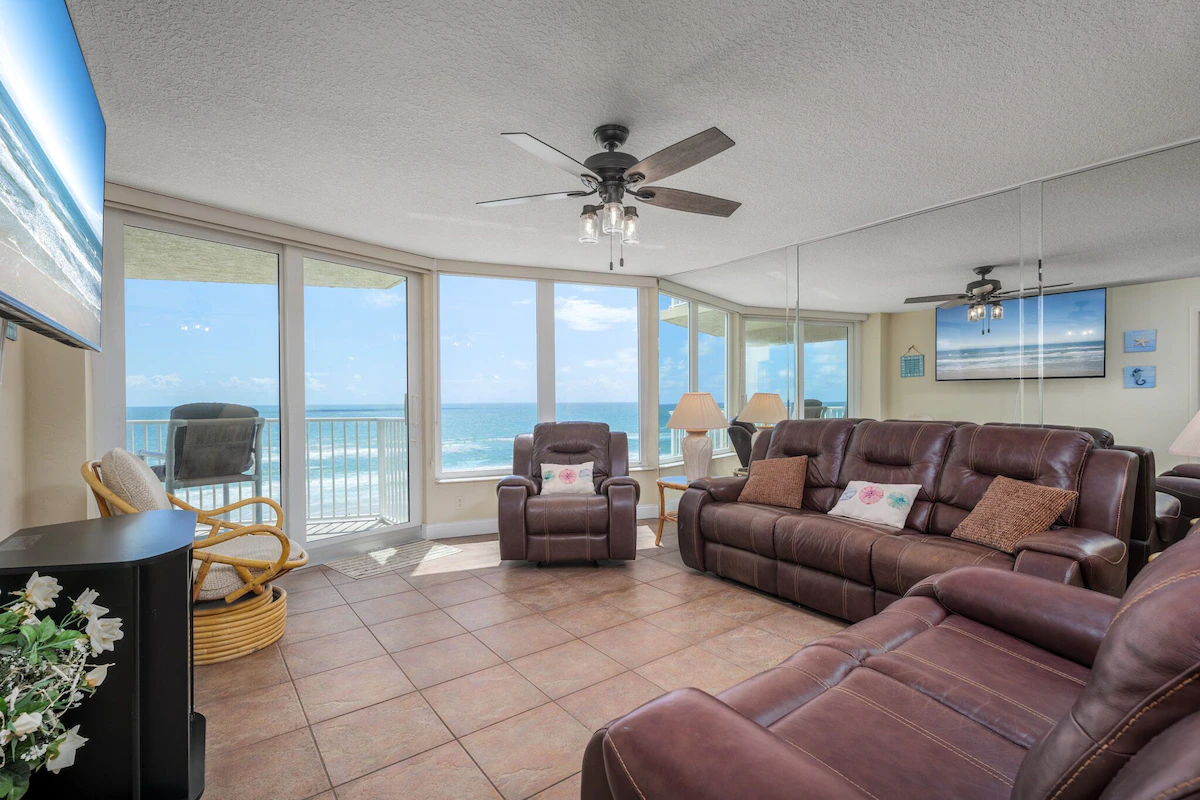 Shores Club 703 is the perfect spot to call home during your Daytona Beach vacation. This condo offers a magnificent view, loads of space and is beautifully decorated. As you enter, you will notice the open concept and the amazing floor to ceiling windows and sliding glass door in the main living space. The living room features a large sofa, loveseat, and chairs situated around the large flat screen television. You and your guests will love all the space in the main living area. Lounge around in the air conditioning after a long day at the beach on the comfy sofa!