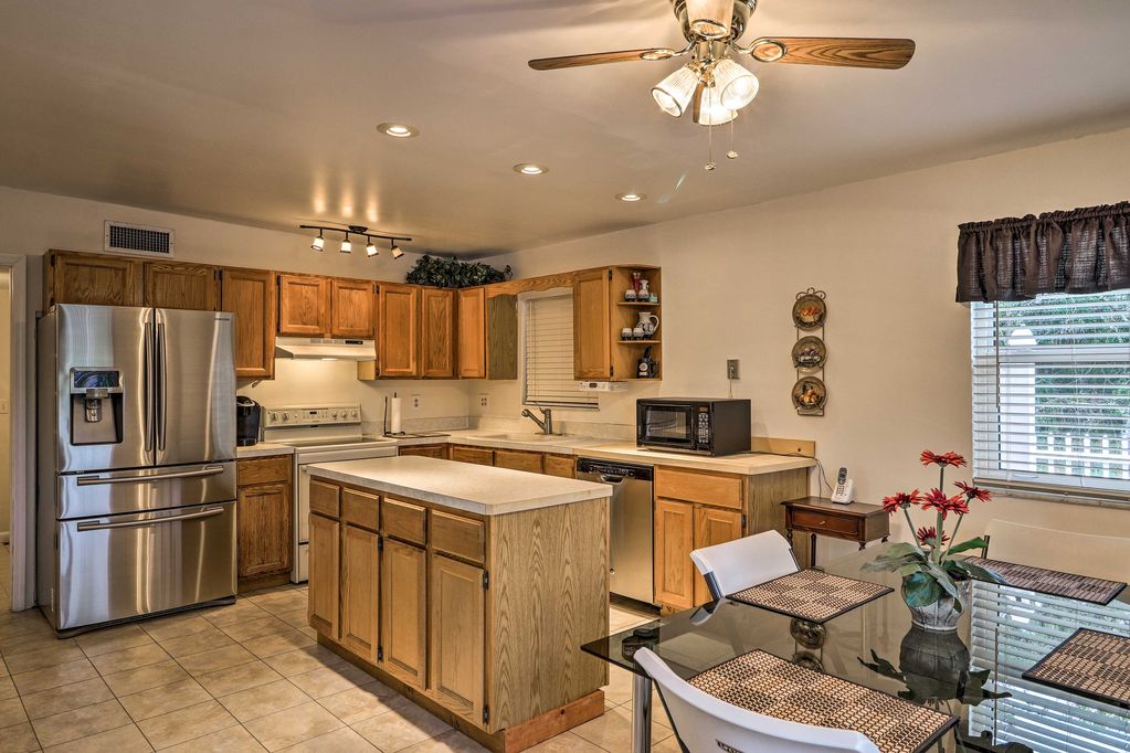 Gourmet meals are a breeze in the fully equipped kitchen with sleek appliances and ample counter space! Dine at the 4-person glass table, the bar-style table with seating for 4, or outside at one of the 2 tables.