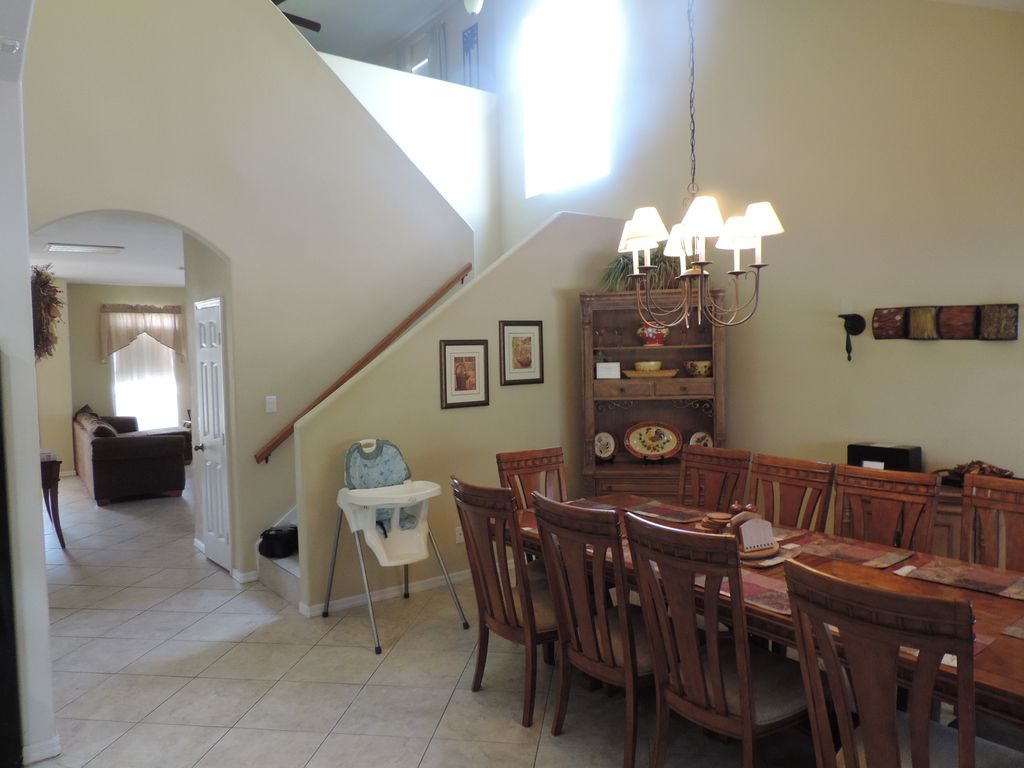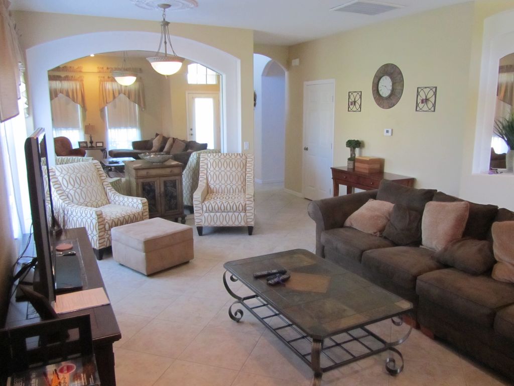 This large professionally decorated executive home for family and relatives is located on a quiets suburban street with minimal traffic and plenty of yard space (3/4 acres). Spacious accommodations feature 5 bedrooms, two entertainment rooms with large flat screen TV\'s, open kitchen with breakfast nook that overlooks a large dining room with cathedral ceilings. Relaxation is assured with a large (16\' x 32\') fully screened in pool. Clear sparkling water is heated with both solar and electrical heat to ensure a invigorating 82 degree swim. The driveway is large enough