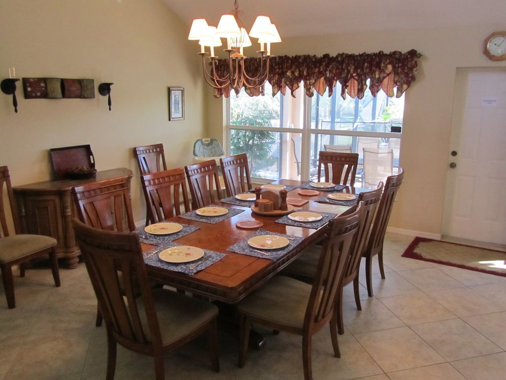 Back to the house. The fully functional kitchen hosts a large refrigerator with icemaker, stove, dishwasher, ample small end appliances, full sweet of cookware, dishes, glasses, and utensils serving 18 people. The breakfast nook next to the kitchen allows guests to socialize while you are cooking. That same nook is surrounded with widows overlooking the pool area and large back yard.