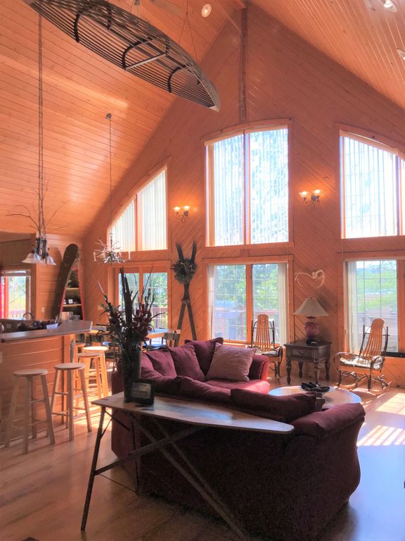 Elevated panoramic lake views along with several untouched wooded conservancy acres, guarantees all guests a clear view to a private get-away experience. Custom built in 2003 and resting on 3 acres, Clearview Lodge’s architecture and open concept design features 25 foot vaulted, spruce ceilings and hardwood floors. This homes rental fees are based on an occupancy of 5, so that smaller groups can enjoy the size and quality of this home. Groups over 5 are subject to additional fees.