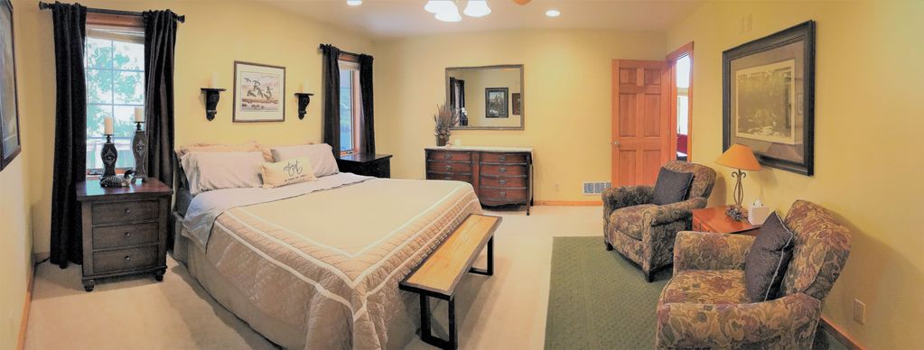 The Great Room is complete with a soaring stone fireplace and an awe-inspiring wall of viewing windows with unspoiled nature and lake views. With 3000 square feet of spaciousness, the Lodge sleeps up to 10 guests and has been meticulously decorated and professionally landscaped.
