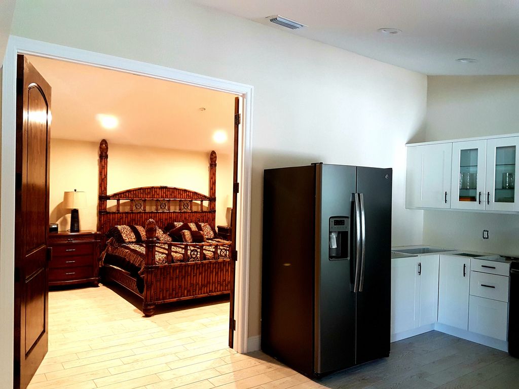 Enjoy a comfortable vacation living in this spacious open floor plan layout, with a huge lanai and a heated pool. The large master bedroom features a king size bed with a bathroom and walk in closet, and has sliding doors that open to the outside patio.