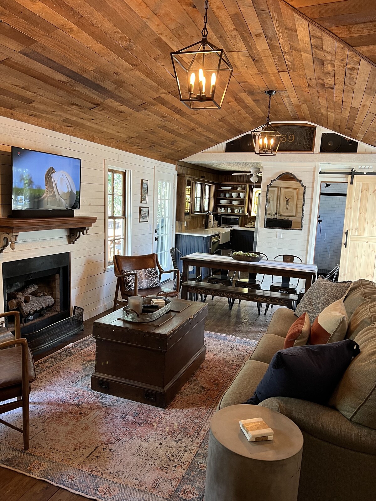 Full kitchen that opens onto living/dining spaces. Two outdoor decks with seating and dining areas. Property is secluded, private, and partially fenced, while still only 3 blocks from Boerne’s historic downtown.