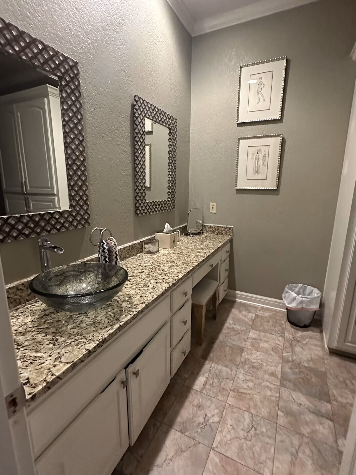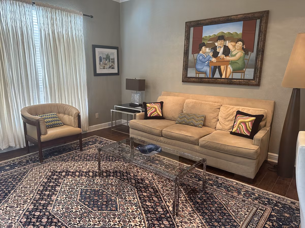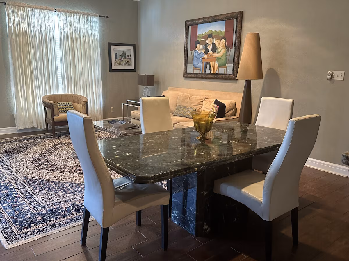 After a 2 year hiatus from VRBO, our property and English Bulldogs are back! We de-listed the property because the city was installing sewer and water lines on and around our property--not conducive to R&R! Now, all quiet on the home front. Discover the perfect getaway at our fabulous guest suite, ideal for a serene and productive retreat. Just 5 minutes from Main Street, 15 minutes from La Cantera/Fiesta Texas, and 30 minutes to Fredericksburg, our elegantly appointed 2-bedroom, one-bath private apartment offers unparalleled convenience and luxury. Experience the ultimate comfort with a private entrance, dedicated A/C unit, and high-speed internet—perfect for those needing to work on vacation. The fully-equipped kitchen features stainless steel appliances, an ice maker, reverse-osmosis water system (say goodbye to bottled water!), a Keurig, and a dishwasher. The laundry room comes with a full-size washer and dryer, iron, ironing board, and pants press for all your needs. Retreat to the master bedroom, complete with a king-size bed adorned with designer linens, a walk-in closet, smart TV, and a writing desk. The second bedroom offers versatility with two custom wrought iron twin beds that can be converted to a king, along with a spacious closet. Relax in the family room, which boasts large windows, a comfy sofa, a marble dining table for four, and cable television. Step outside through the family room door to the covered patio, where you can enjoy the pool and heated spa. Savor your morning coffee or grill dinner on the patio, surrounded by the tranquility of our serene setting. Explore the property and you might meet our chickens, very friendly English Bulldogs—Watson and Maize, and our Great Dane, George! Our guest suite is perfect for adults seeking a luxurious, peaceful, and productive escape. Book now and indulge in the ultimate blend of comfort and convenience!