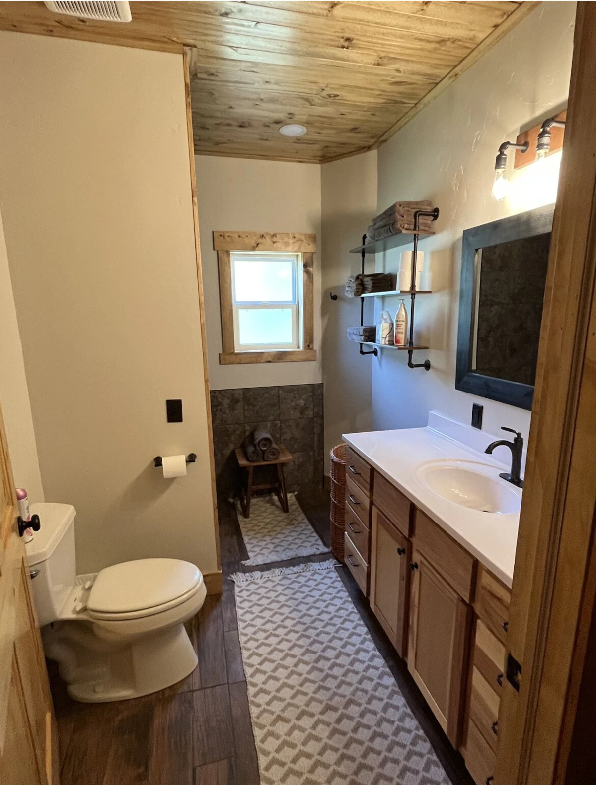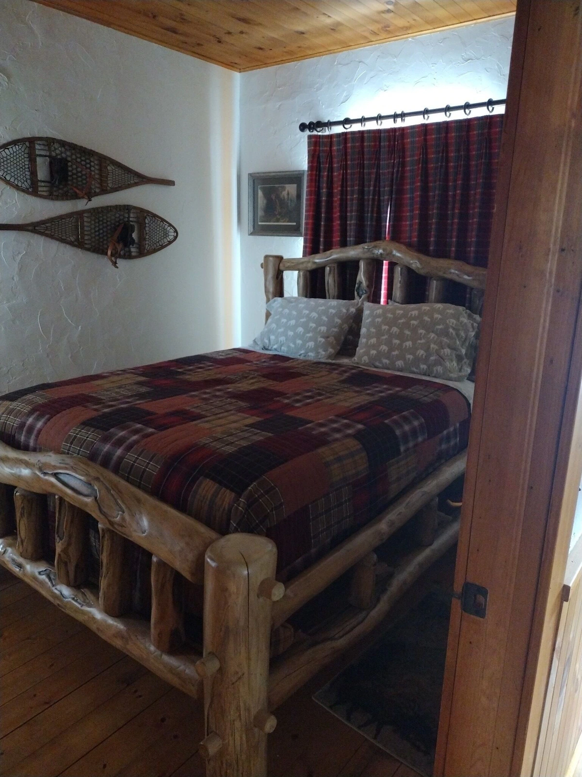 The main level includes an open concept kitchen, dining and cozy living area. A fully equipped kitchen was recently remodeled with high-end Jenn-Air appliances. We invite you to utilize the newly remodeled pantry including extra kitchen equipment, storage, and laundry. The dining and cozy living areas have been revived, including new furniture, an electric fireplace, and smart TV. The main level bedroom is furnished with a new beautiful queen-size log bed and a large closet. The newly remodeled and expanded bathroom on the main floor consists of an oversized vanity with lots of storage, a new tiled walk-in shower and newly tiled floor throughout. This bathroom is located directly across from the bedroom on the main floor.