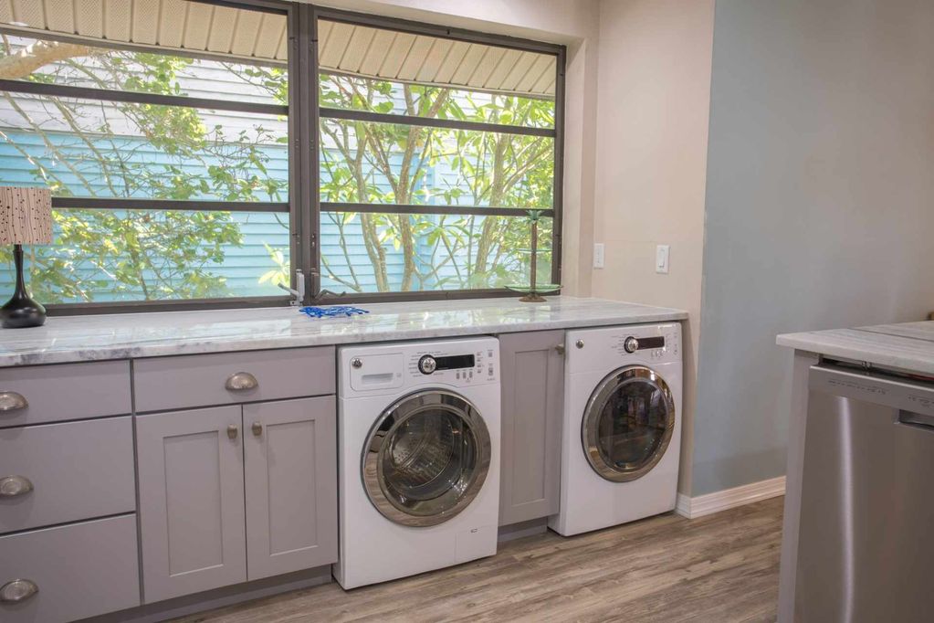 The large, completely renovated kitchen features new appliances with everything you need. The wraparound deck includes a table with seating for 6-8 and has partial views of the Gulf and Bay.