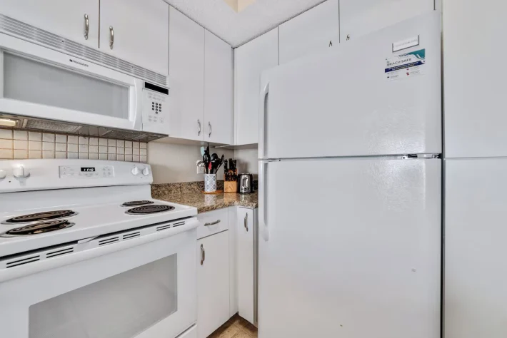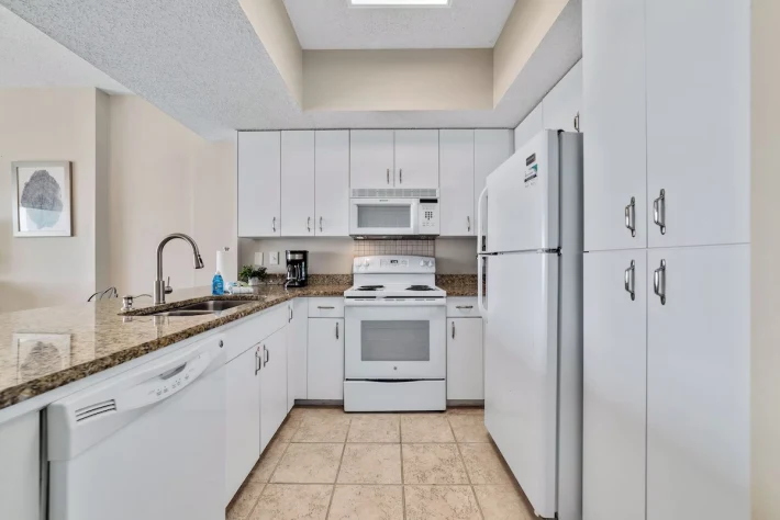As you enter Tidewater 505, the one bedroom is immediately to your right. This bedroom features a queen-sized bed, wall mounted flat screen tv, closet and direct access to the shared bathroom. This bathroom has a tub/shower combo. In the hallway, there are built-in twin sized bunk beds. There is also a washer dryer combo for added convenience. Continuing inside, you have a full kitchen stocked with all of the needed essentials to prepare a meal should you decide to stay in. There is a table with seating for three and additional seating for three at the bar. Enjoy your meals while taking in the stunning views through the sliding glass doors. In the living room area, there is comfortable seating (sleeper sofa) for down time to watch the flat screen tv. Or step out onto your private balcony, featuring a table with seating for four, and breathe in the fresh salt air while listening to the waves crash along the shoreline.