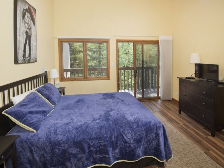 The master bedroom is off the right of the living, and has an en suite bathroom. The master bathroom has double vanities, a tub/shower combination. There is an additional full bedroom and bathroom on the 2nd floor. The master bedroom has a flat screen TV as well as the living area. The living area does have a large wrap a round sofa.