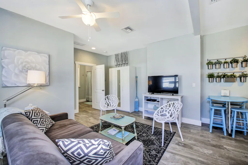 The Sedgwick cottage has a full kitchen with farmhouse sink, gorgeous Quartz countertops and stainless steel appliances, with wonderful peeks of the Gulf through just about every window, as well as from your private deck landing. New, wood-grained ceramic tile floors throughout. The bedroom is brightly lit and has a Queen sized bed, flat screen TV, and plenty of storage space. The living room has a Queen sleeper sofa for additional guests. This cottage will sleep 4 - maximum number of guests is 4. The bathroom is nice & large with a bathtub/shower combination. Parking on site.
