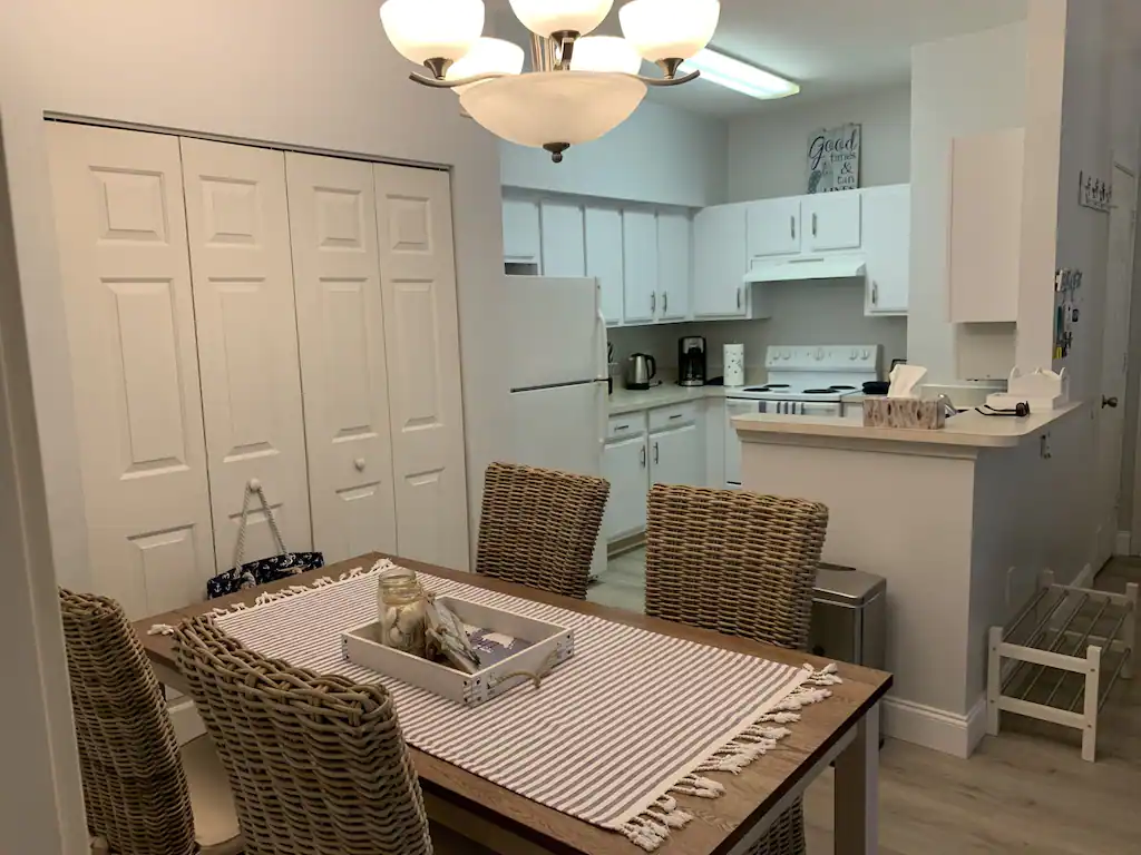 Situated 8 to 10 minutes of relaxed driving to the famous Clearwater Beach (ranked No1. in the US and one of the top 10 beaches in the world) the condo features a spacious living room adjacent to an open concept kitchen and dinette. Cabinets contain glassware, dishes, pots and pans and utensils.