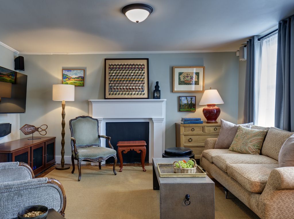 The dining room will comfortably seat 8. The table is a mid 19th century eagle claw round table with expansion leafs. The decorative fireplace from the mid 19th century adds character.