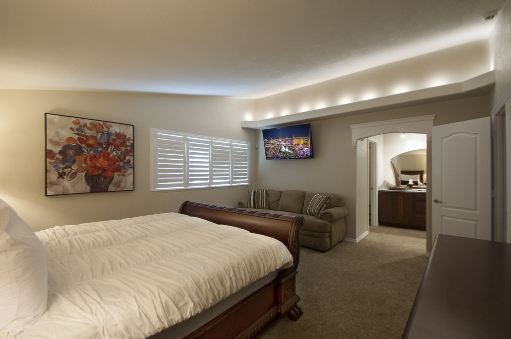This beautiful vacation home has been designed and remodeled inside-out to offer travelers a luxurious, clean and accommodating stay central to the Las Vegas Strip. Guests can enjoy a newly redesigned backyard desert oasis landscape and a refreshing, remote controlled pool with attached in-ground spa and LED lighting. Take in your morning coffee under the covered patio with fans, dining table and sectional. Enjoy the sunsets at the fire-pit table and soak up the Las Vegas sun in one of the many lounging chairs. Cook your dinners on the BBQ grill.