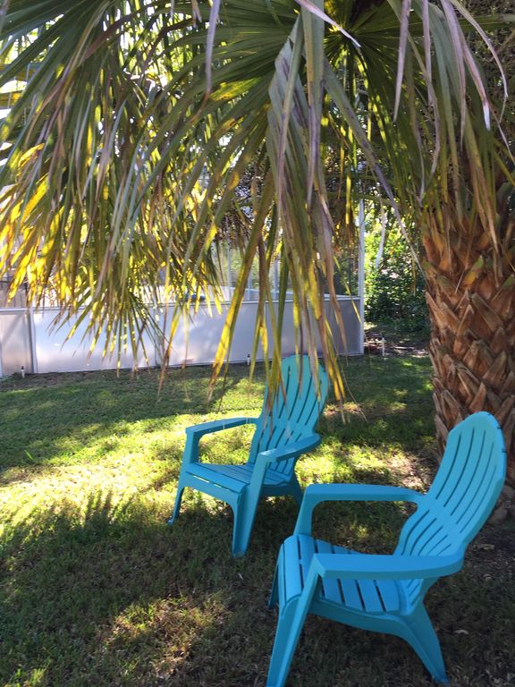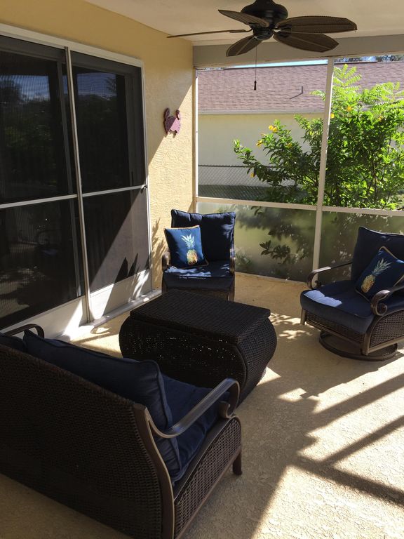 Come and visit the Sunshine House! Wonderfully decorated home with 3 bedrooms, 2 full bathrooms and beautiful blue inground HEATED swimming pool with child fence. Sit and relax on the outside covered and screened lanai with table, chairs, patio furniture, ceiling fans and mini fridge. Master bedroom has a king sized bed with pillow top mattress, walk-in closet, desk, tv and private sliders to the pool. Master bathroom has a double vanity with double sink and a walk-in shower. Living room has 50” flat screen tv, a dining / seating area and a triple slider that opens super wide to the pool. Home also has free wi-fi and Directv.