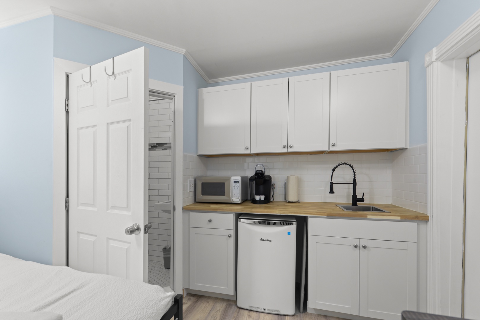 Kitchen features a mini fridge, both K-Cup and drip coffee maker, microwave oven, toaster oven, induction hot plate for some light cooking and a counter top icemaker for mixing up your tropical cocktails.