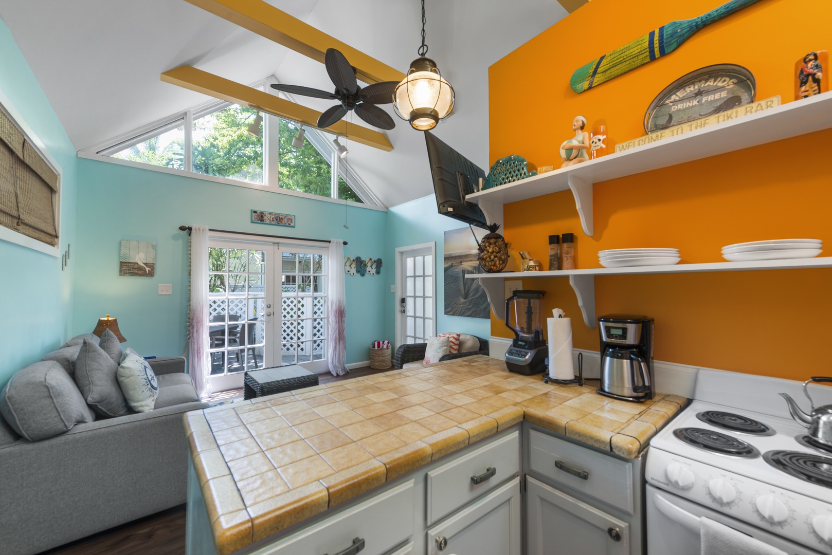 The fully appointed kitchen is attached to the living area and features a sit-down bar, charming open shelving and a bright color scheme.