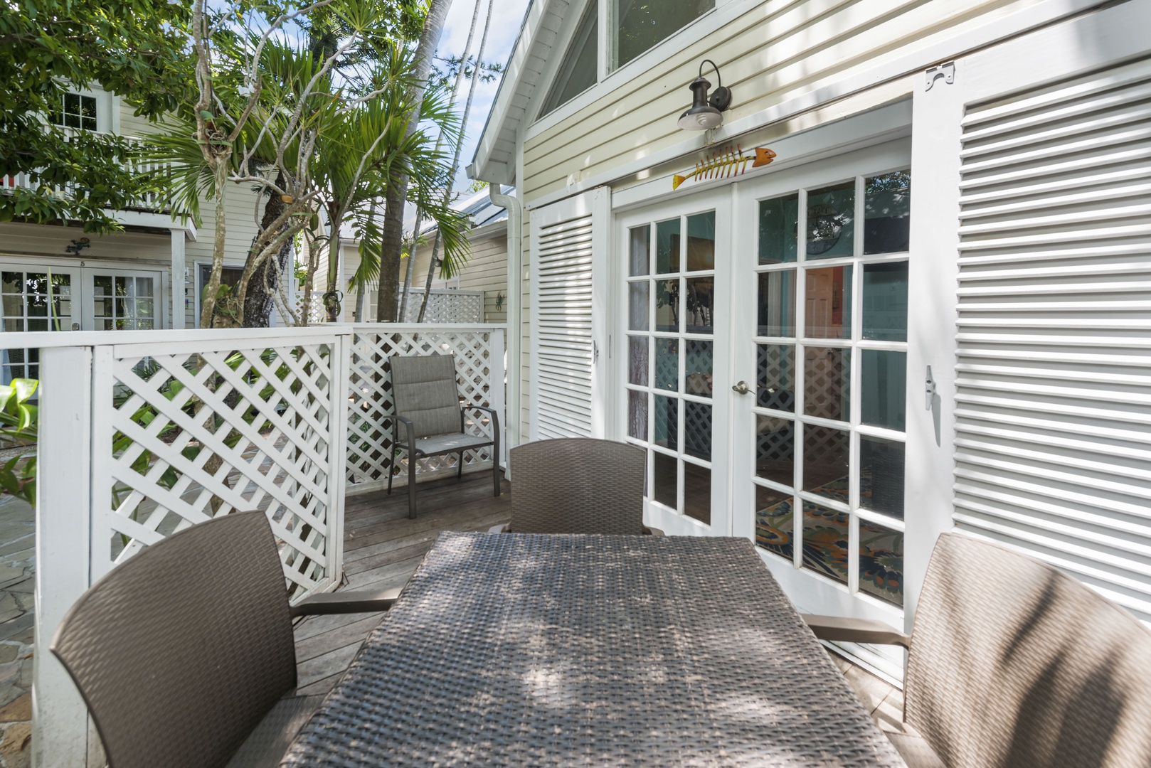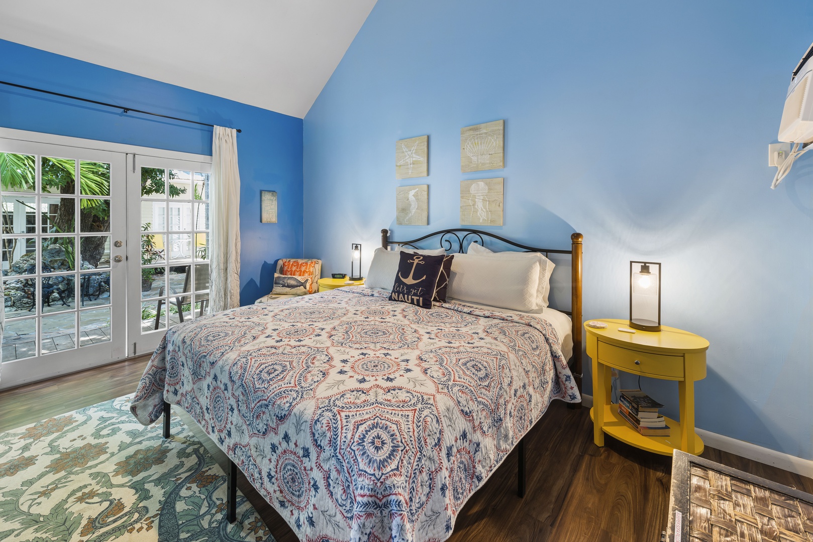 Located in The Colony, a secluded, gated enclave just steps from Duval Street, Colony Sunset is a colorful and relaxing retreat. Walk up the flagstone path and enter the home through the vivid and cheerful living space, accented with cerulean blue walls and splashes of tropical art. A vaulted ceiling with exposed beams and huge transom windows that extend all the way to the tip of the roof add a bright and airy feeling to the cozy space. Just through the French doors lies a private deck for sunning, relaxing and al fresco dining.