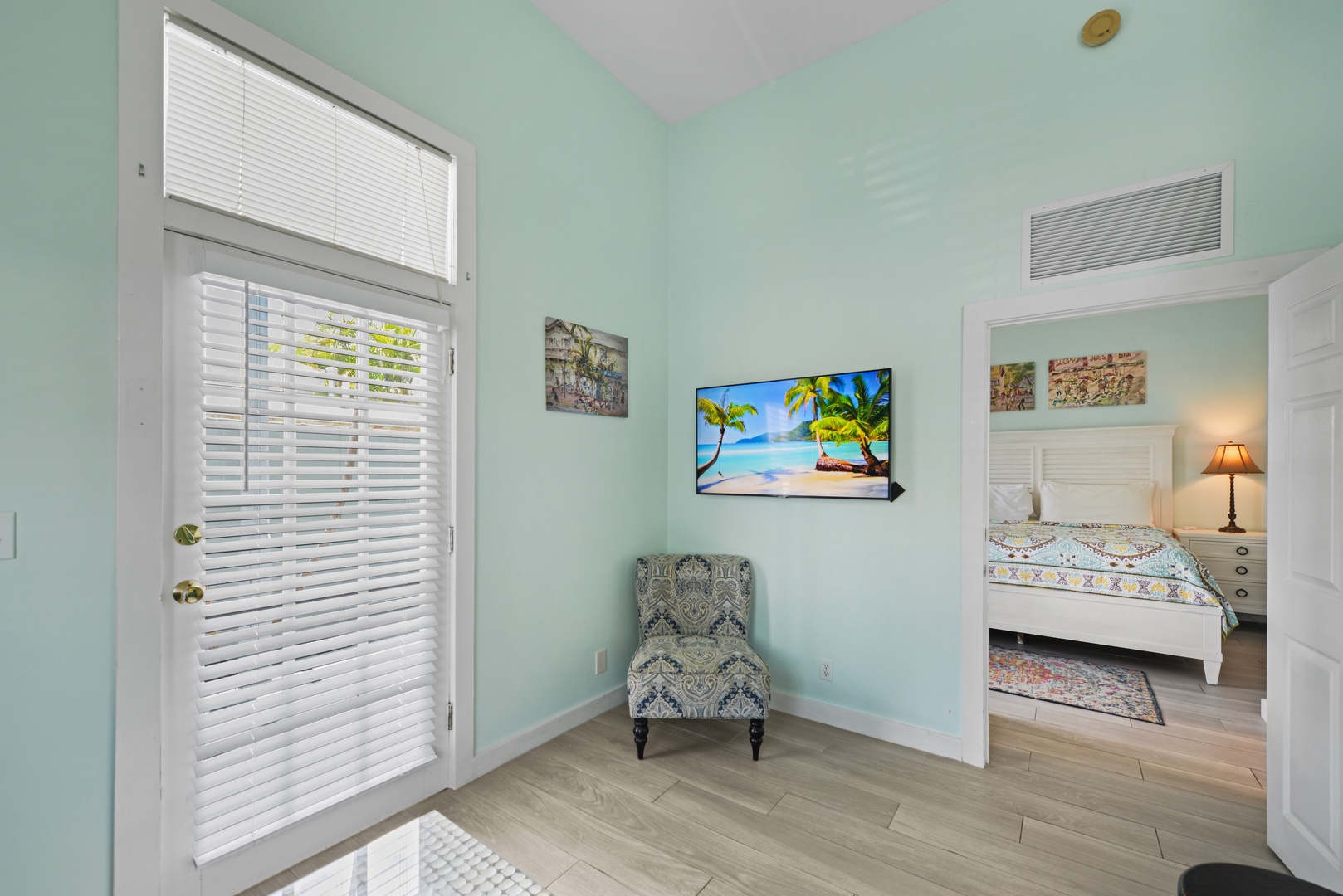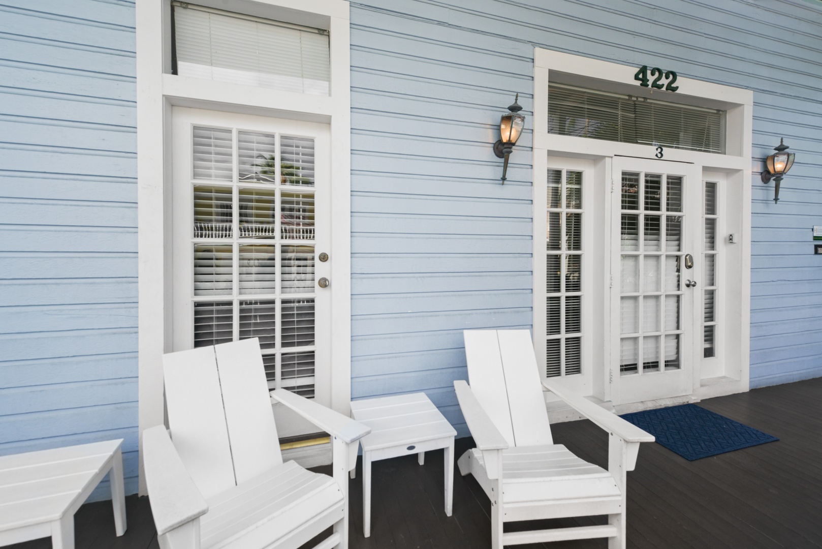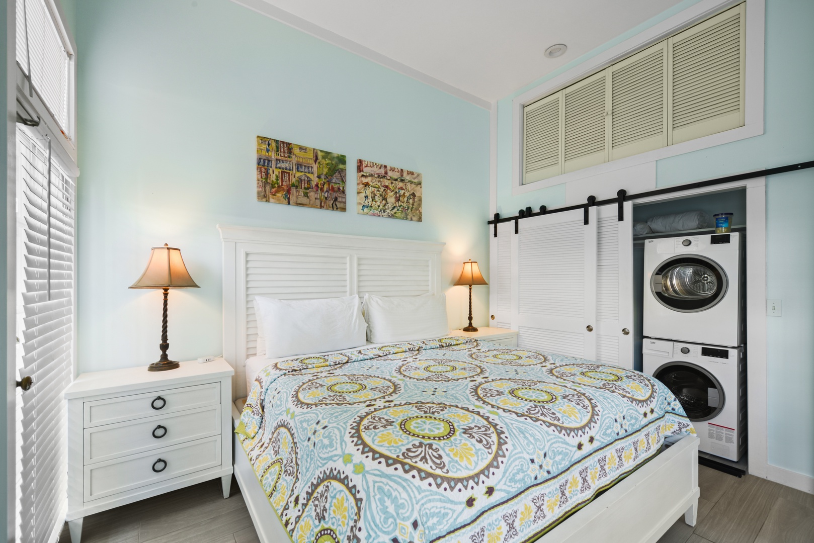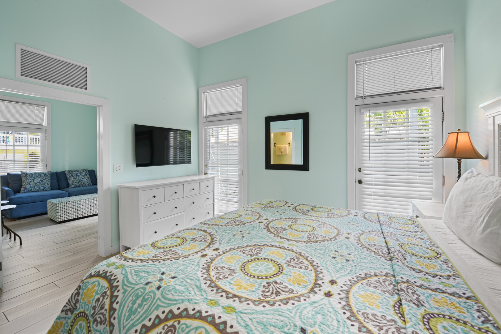 The primary bedroom features a comfortable king bed and two nightstands for the late night reader. Walk out onto the porch from the bedroom with a cup of coffee or margarita to enjoy people watching!