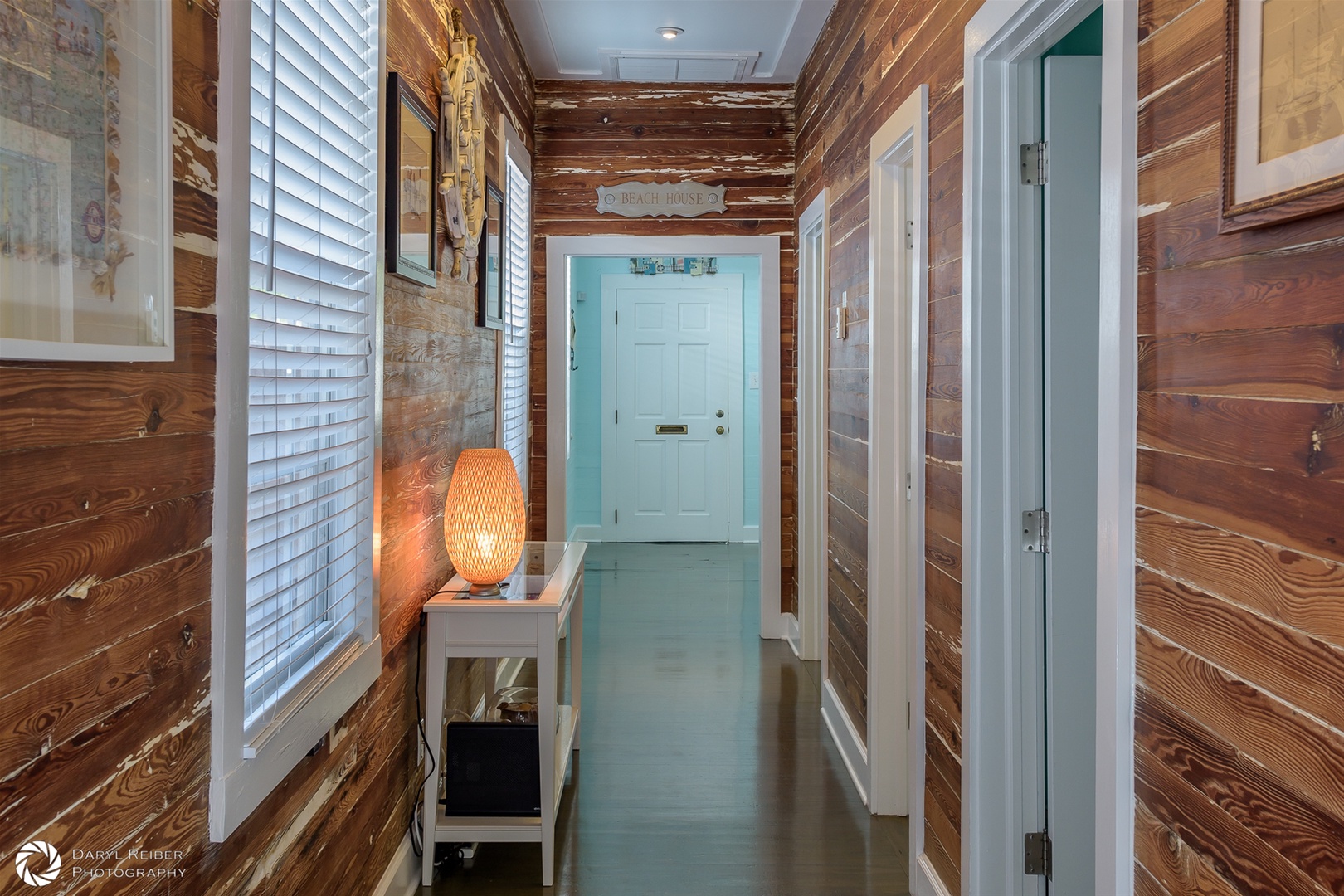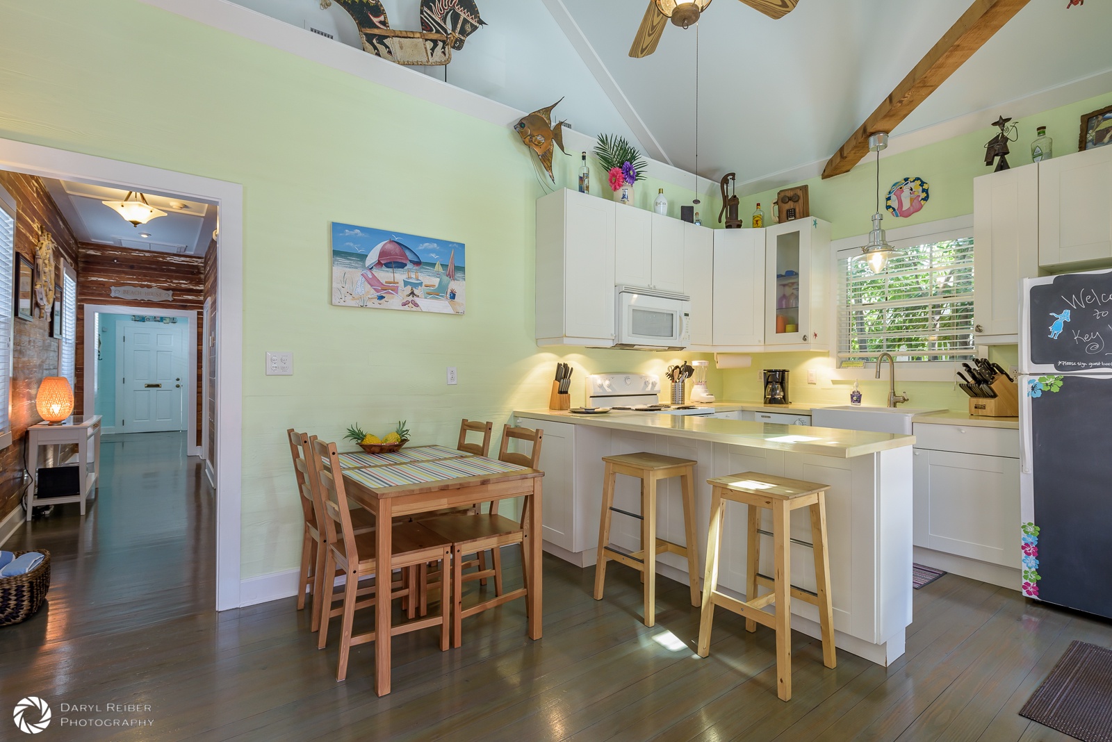 The contemporary kitchen with a cathedral ceiling is equipped with a full-size refrigerator, stove/oven, all cookware, utensils and dishes. The kitchen has a dining table and seating for four in addition to two stools at the breakfast bar. Glass sliding doors open to a fenced, private deck that includes a gas grill, two chaise lounges, built-in benches, an outdoor dining table, and an outdoor shower. The living room contains a queen convertible sofa. All linens and towels, including beach towels, are supplied. The home is equipped with a washer and dryer located in a bathroom closet. The owners have installed a central air system, which is a luxury that few Old Town rental properties possess.