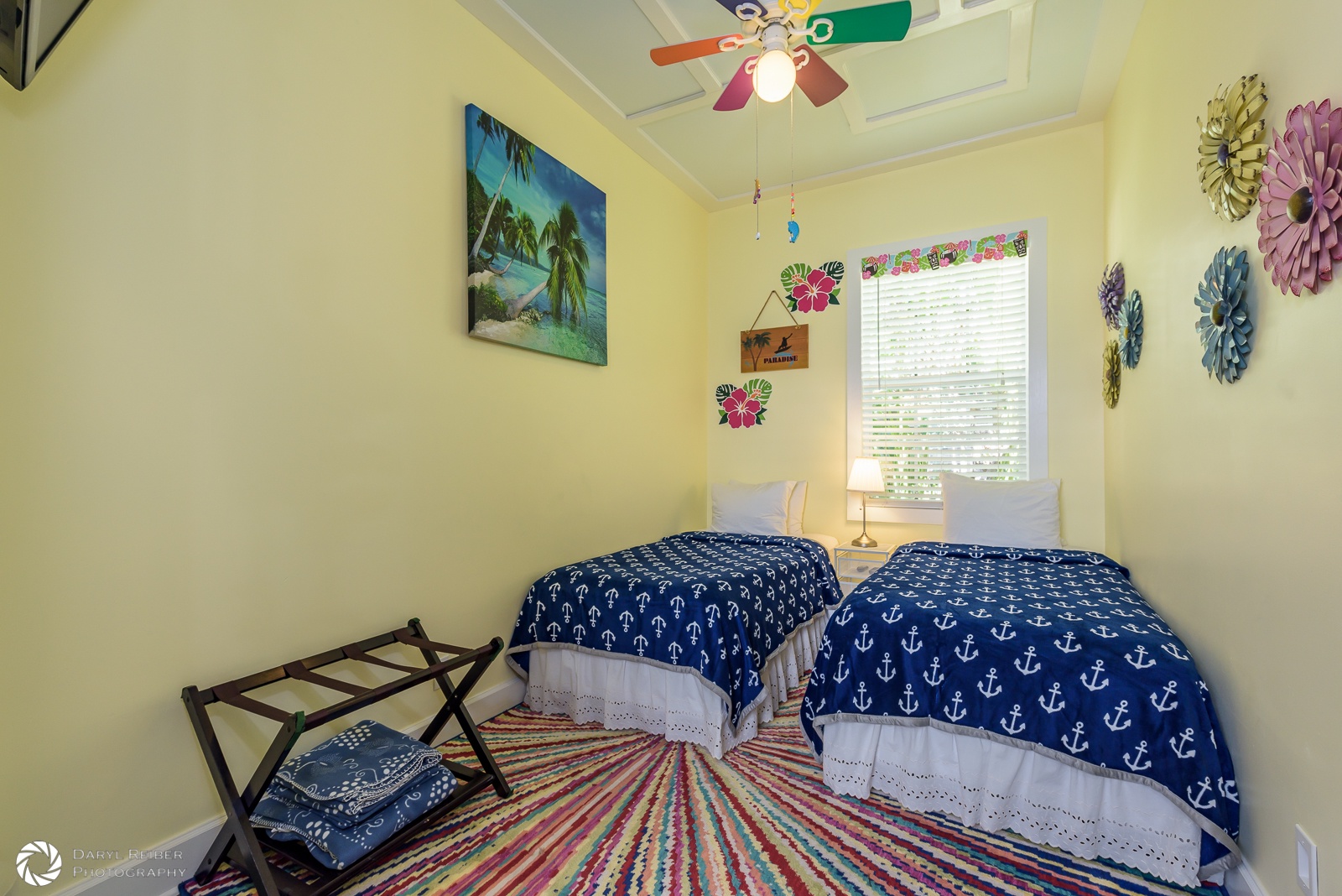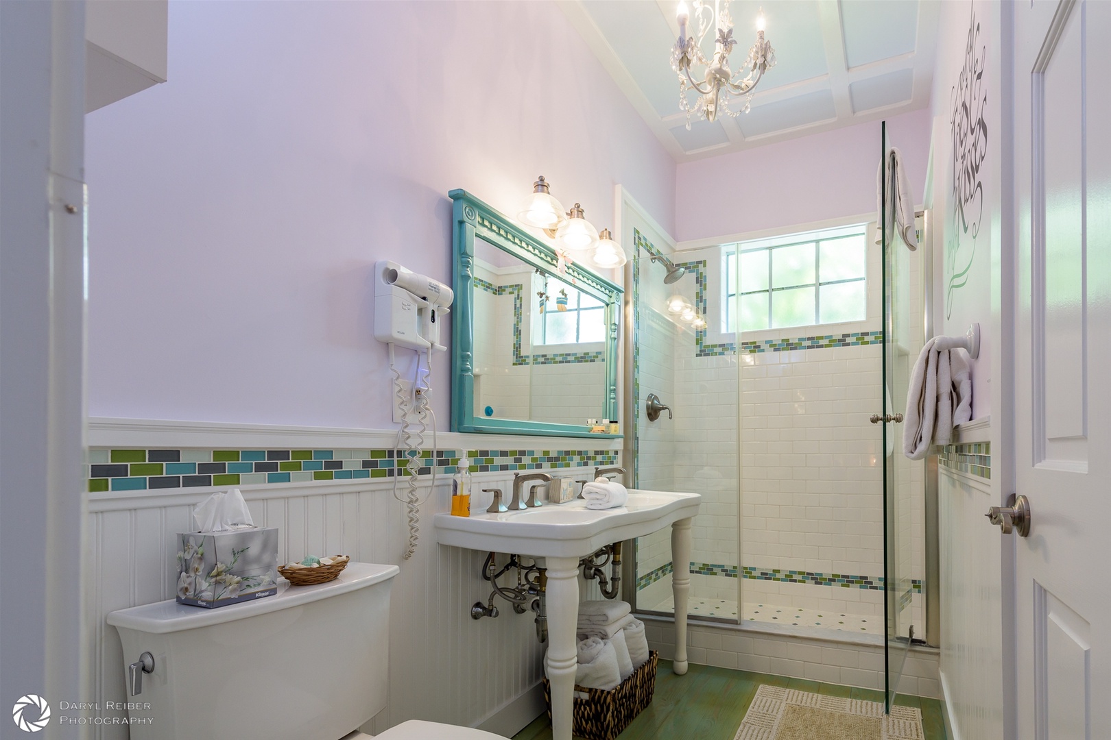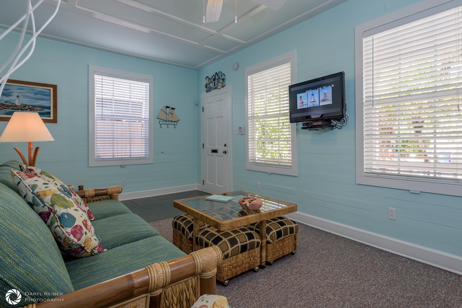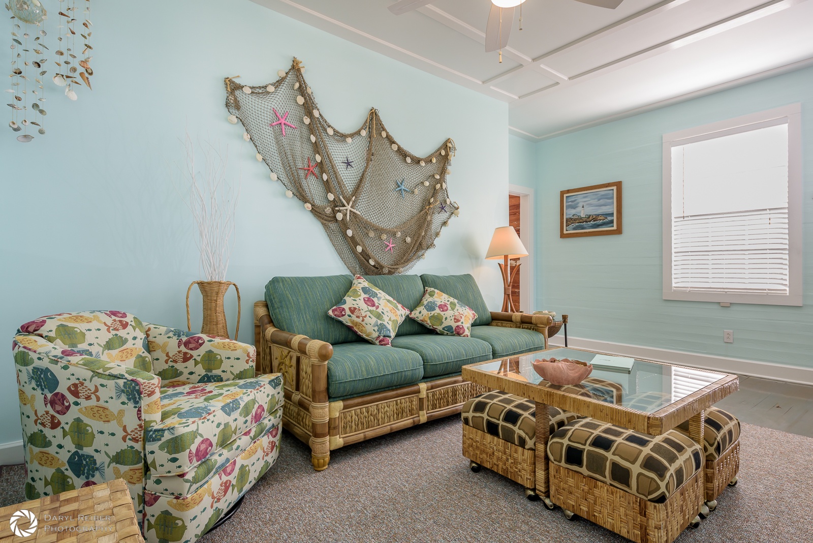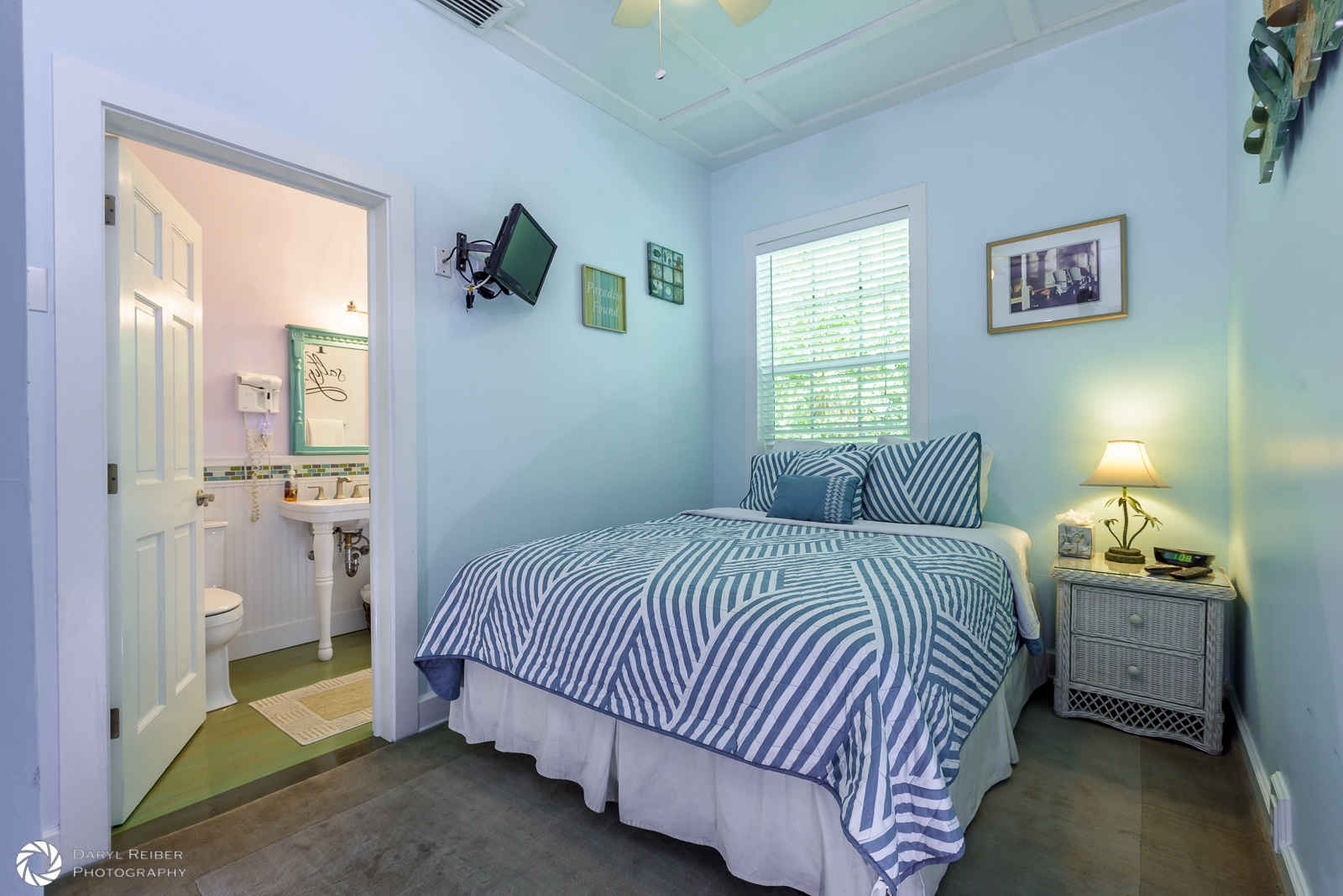 Both bedrooms share the common area bath, with double-basin pedestal sink and beautifully tiled walk-in shower. One bedroom has a king bed and the other has two twin beds. Both bedrooms and the living room contain flat-screen TVs. The large front porch is a few steps above the street, making it the perfect place to sit on the wicker chairs and relax with your morning coffee.