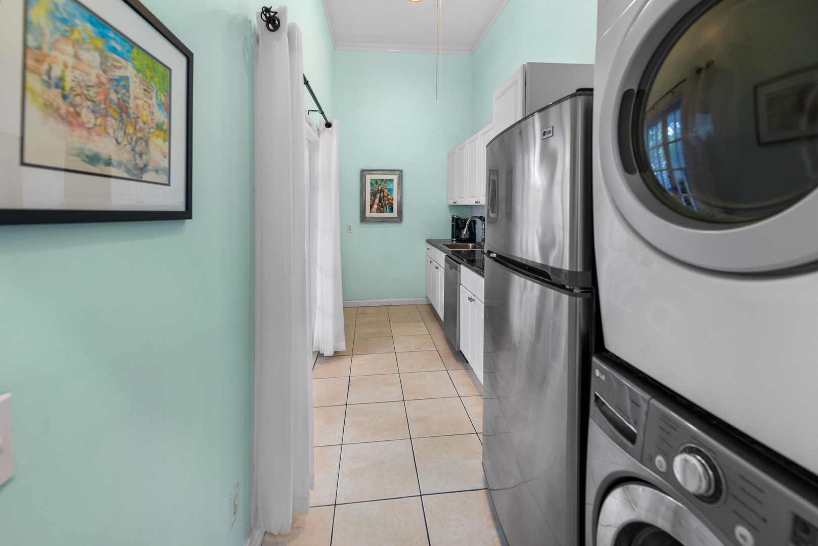 This spacious ground-level two-bedroom, two-bathroom property is located in the heart of Key West right off of Duval Street. A private, enclosed patio beckons you to relax in peaceful seclusion. The primary bedroom features a king-sized bed and a 32\" flat-screen TV. The second bedroom has a queen bed. The living room area has as well as another 32\" flat-screen TV. The kitchen features a full-sized refrigerator, oven, toaster, microwave, and coffee maker to do all or none of the cooking while enjoying the island life. This property comes equipped with a private porch, air conditioning, free wi-fi, and an in-unit washer/dryer.
