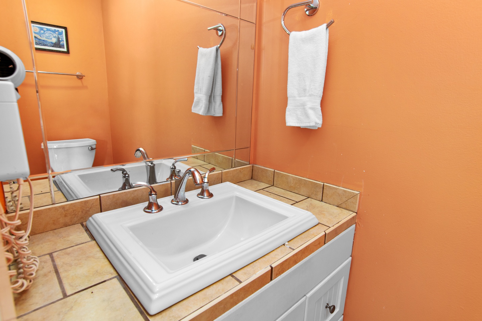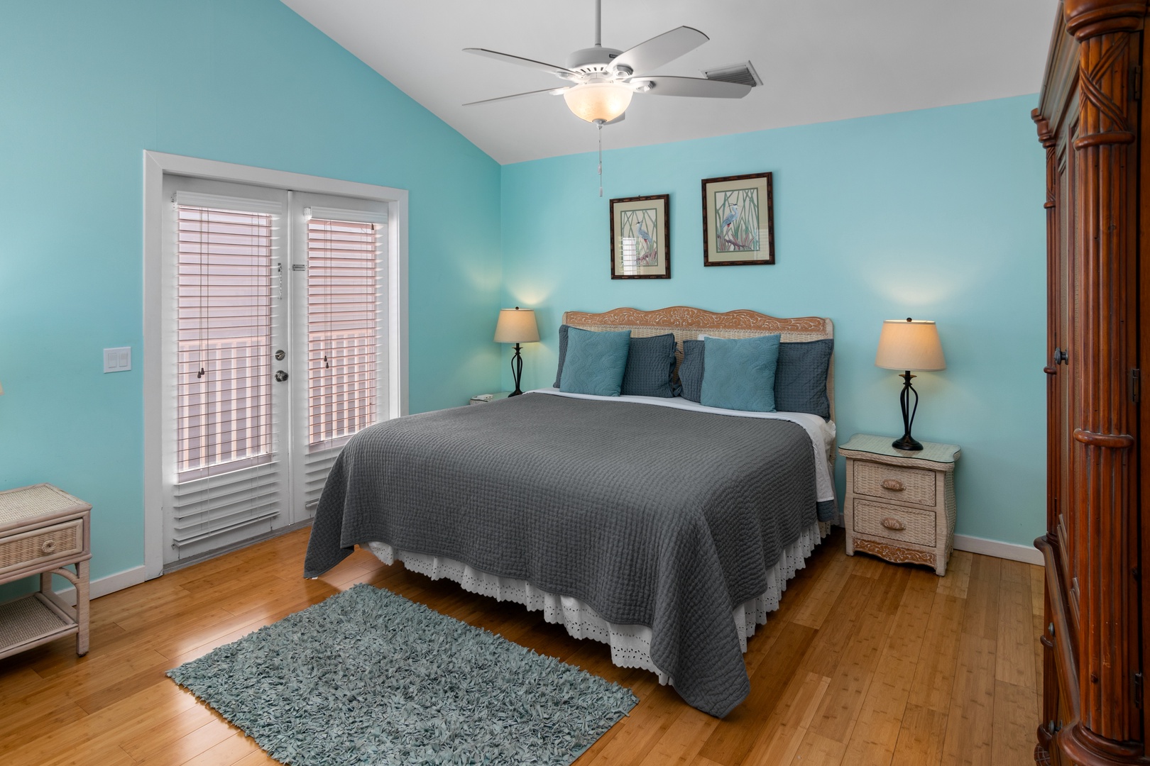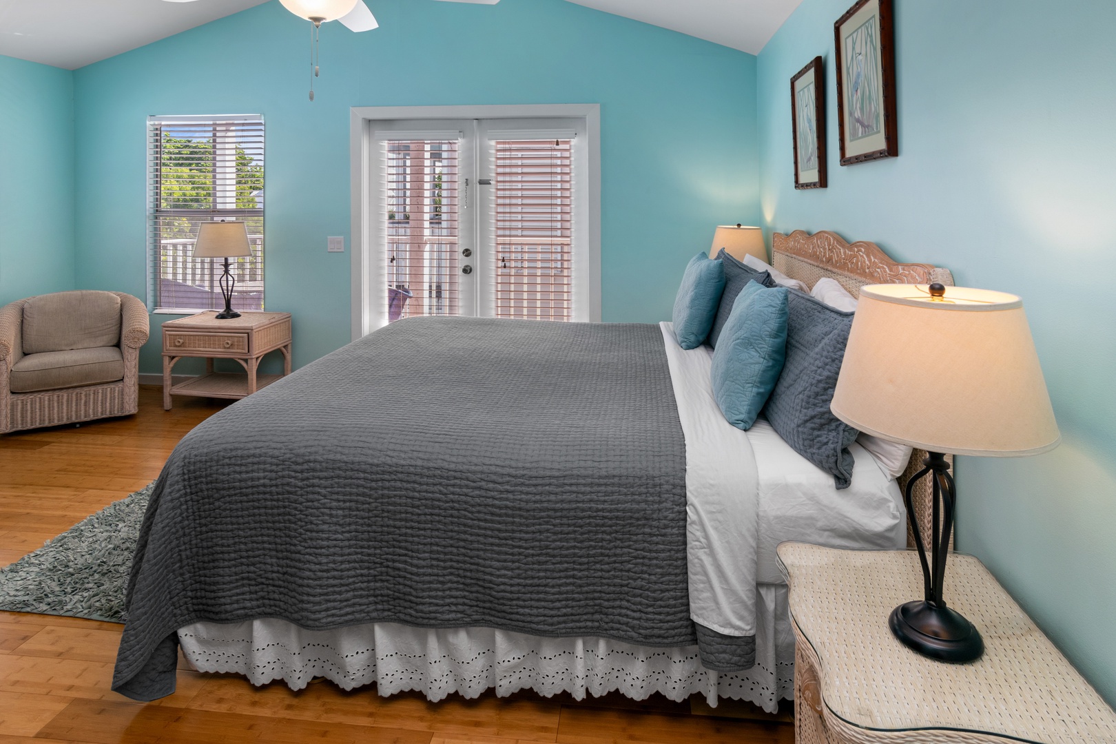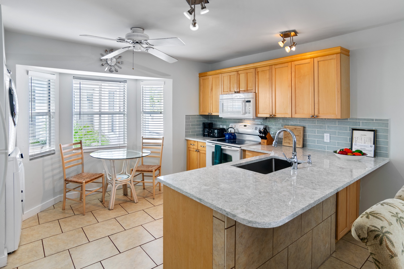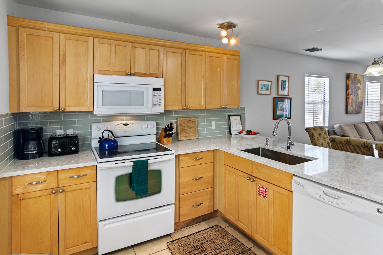 The foyer of this Mediterranean-style unit opens to the living room, dining area, half-bath, and kitchen. The living room contains a queen-sized sofa bed, flat-screen TV with cable, side tables, and a dining area for six. It also features French doors opening to your own private outdoor patio with chairs. With a breakfast nook for two to enjoy your morning coffee, the open kitchen is fully-equipped with a refrigerator, stove/oven, dishwasher, washer/dryer, drip coffee maker, and toaster.