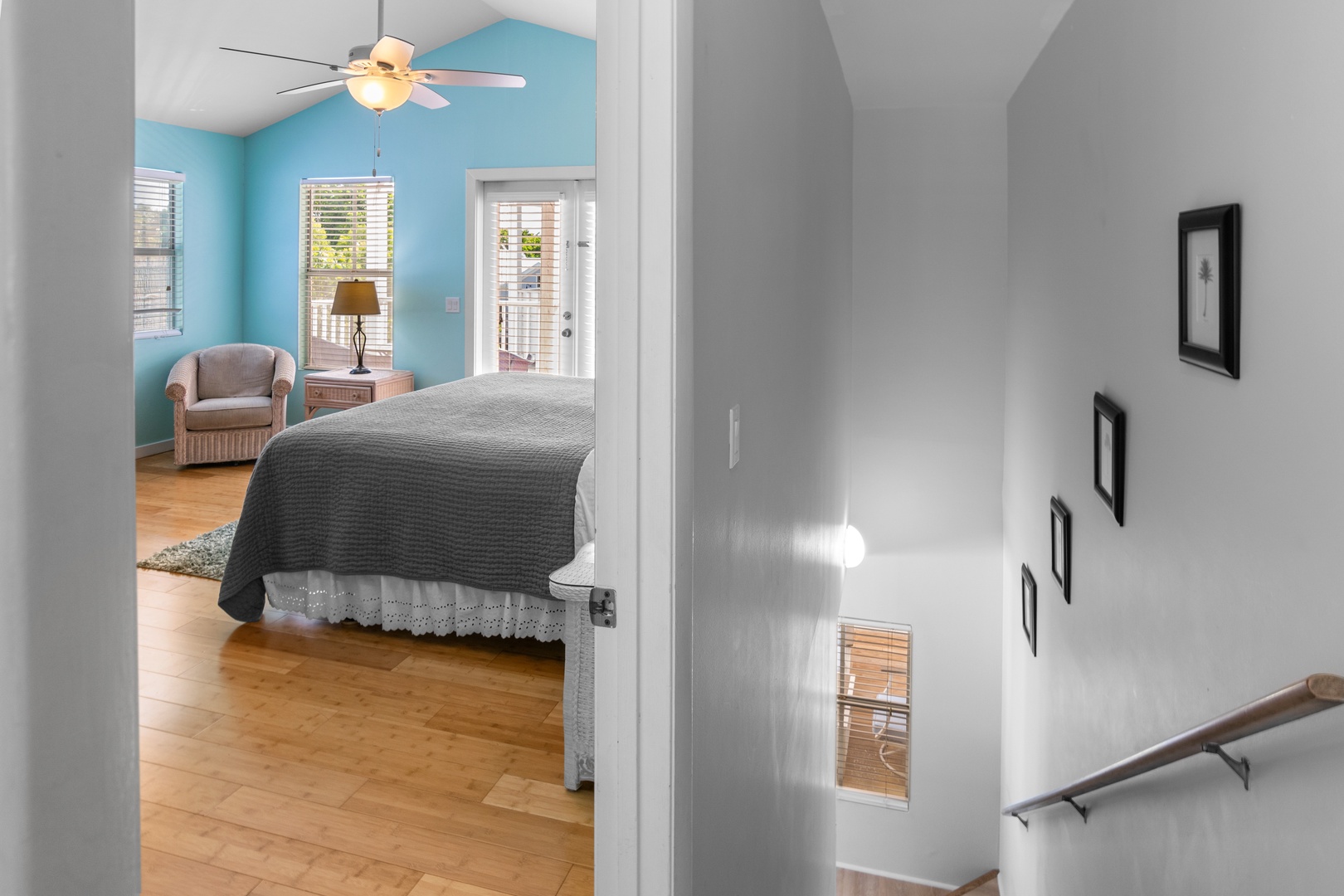 Upstairs, the primary bedroom has a king bed, sofa for lounging, and French doors opening onto a private porch with seating. The primary also has a large ensuite full bathroom with a walk-in shower, vanity, and skylight. The second bedroom features a queen bed and private full bath.