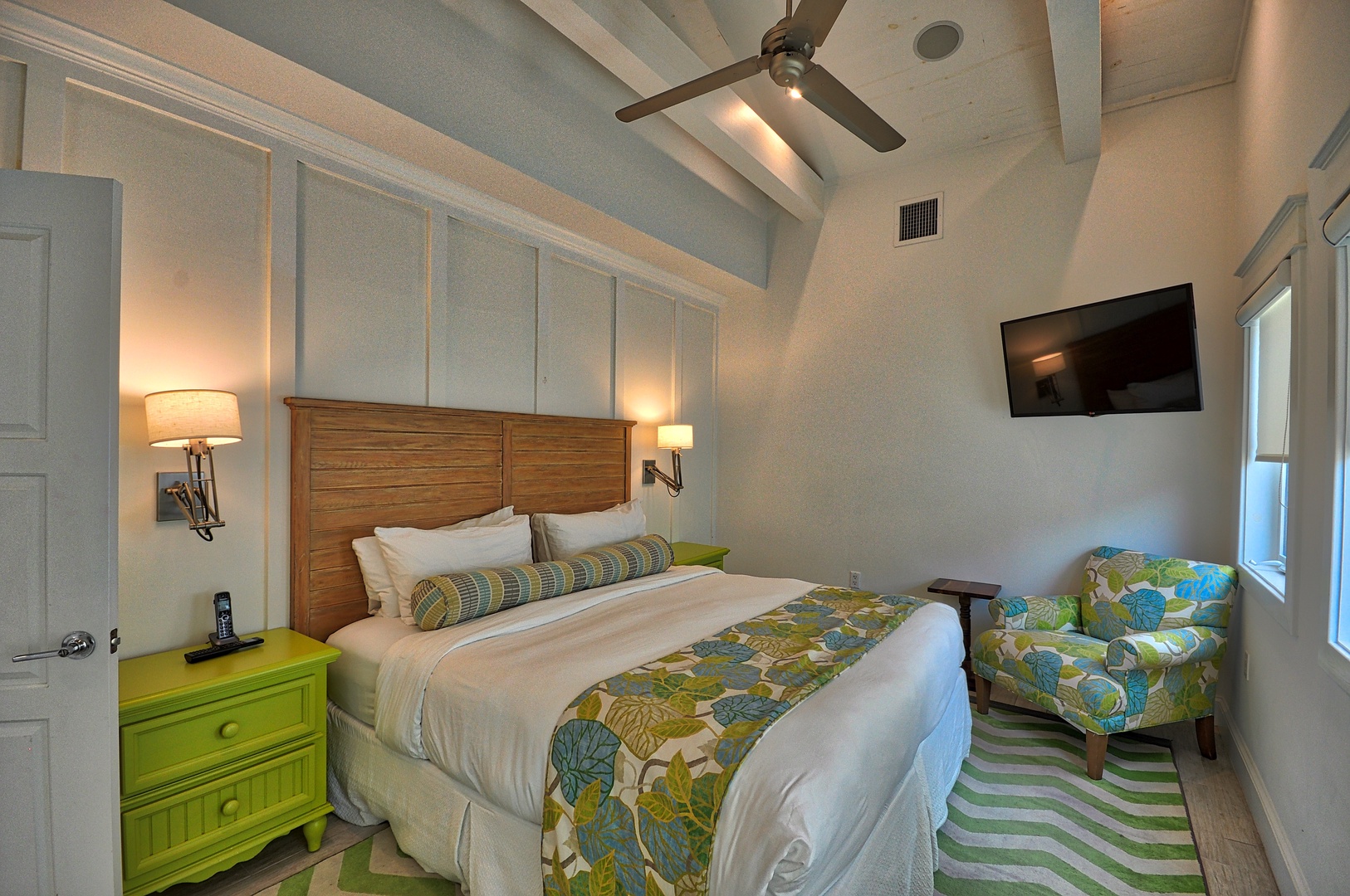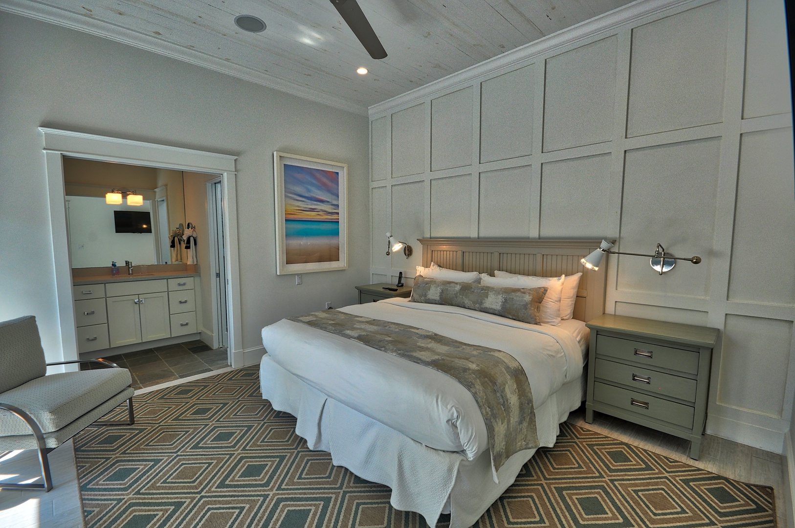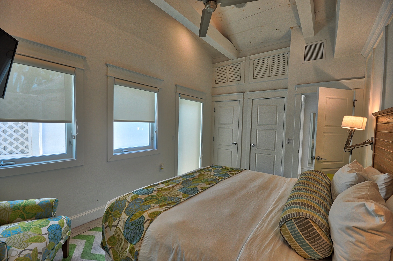 Enter the home and fold the doors away for a totally open indoor/outdoor living environment. The open floor plan of the living, dining and kitchen is beautifully designed with comfortable yet classy furnishings. Set against a backdrop of gray washed wood walls with just the right pops of color, the space sets a totally relaxing mood. A sparkling white kitchen is refreshing to the eye and super functional (including drip coffee maker). Bedding: 3 kings