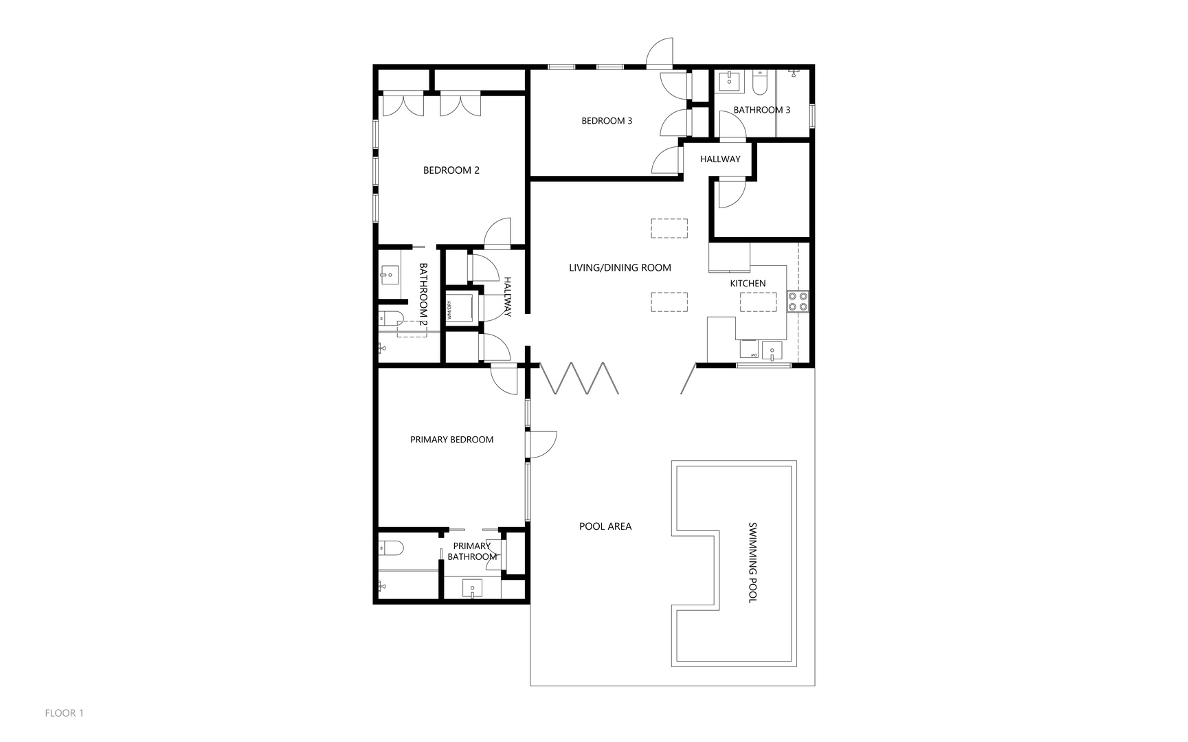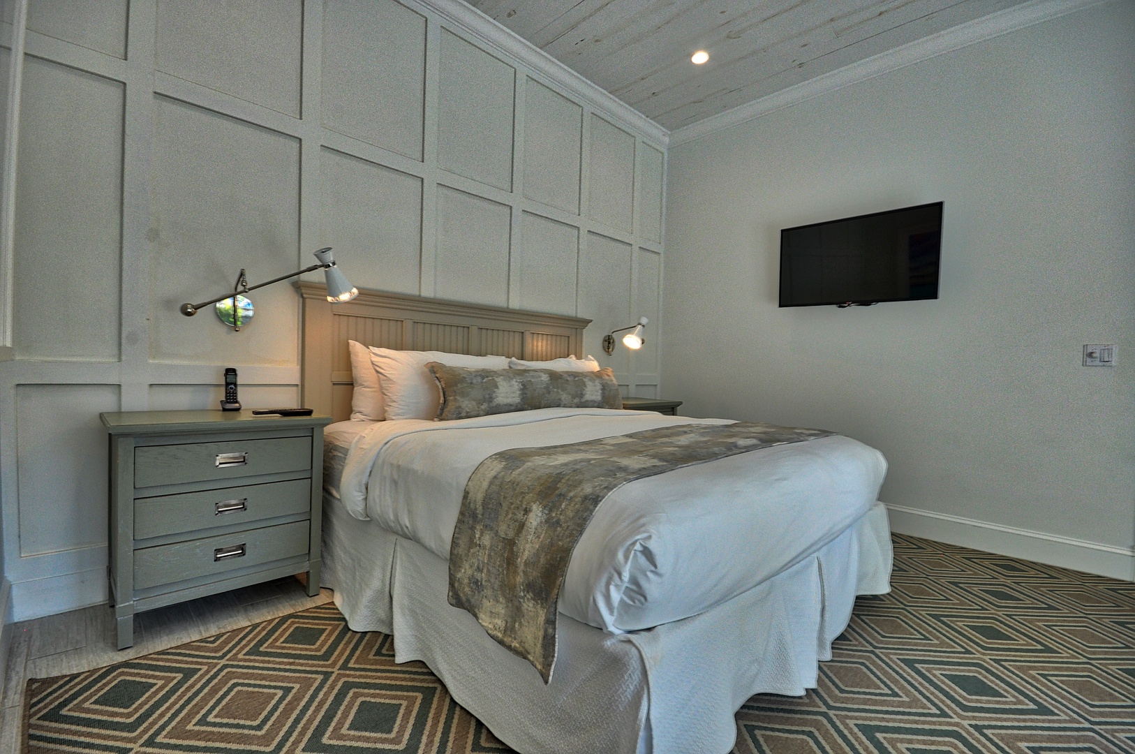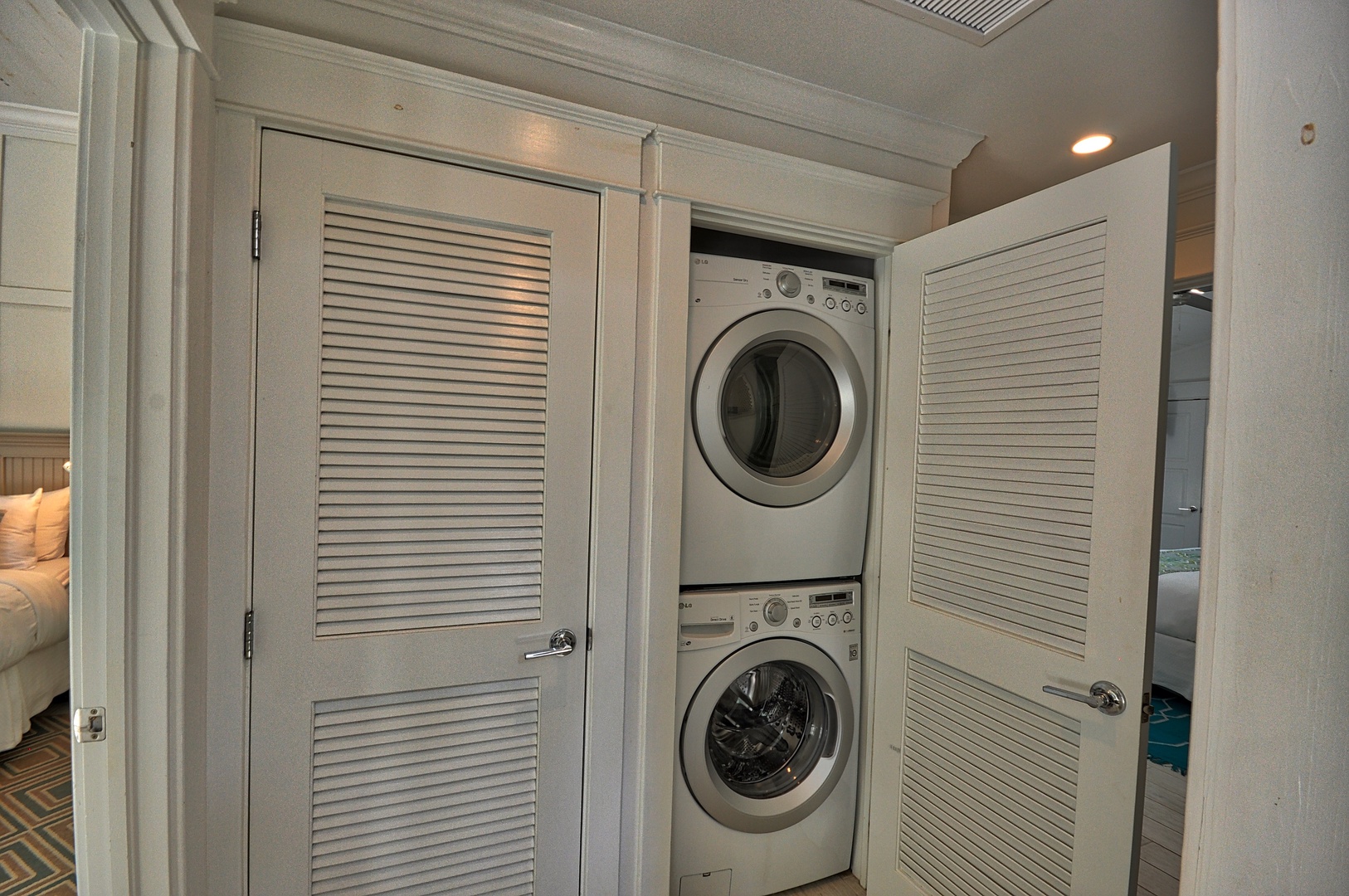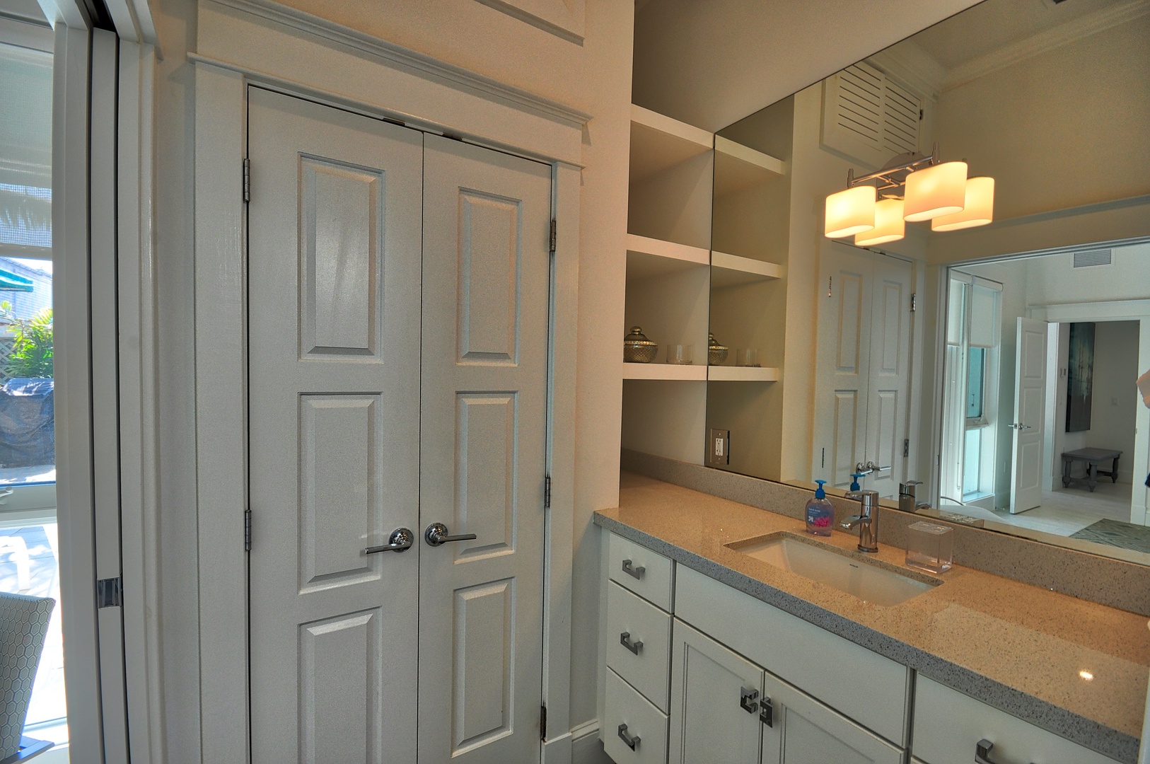 Enter the home and fold the doors away for a totally open indoor/outdoor living environment. The open floor plan of the living, dining and kitchen is beautifully designed with comfortable yet classy furnishings. Set against a backdrop of gray washed wood walls with just the right pops of color, the space sets a totally relaxing mood. A sparkling white kitchen is refreshing to the eye and super functional (including drip coffee maker). Bedding: 3 kings