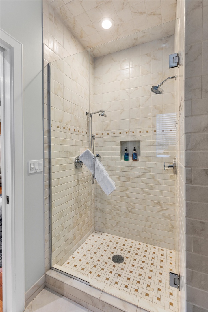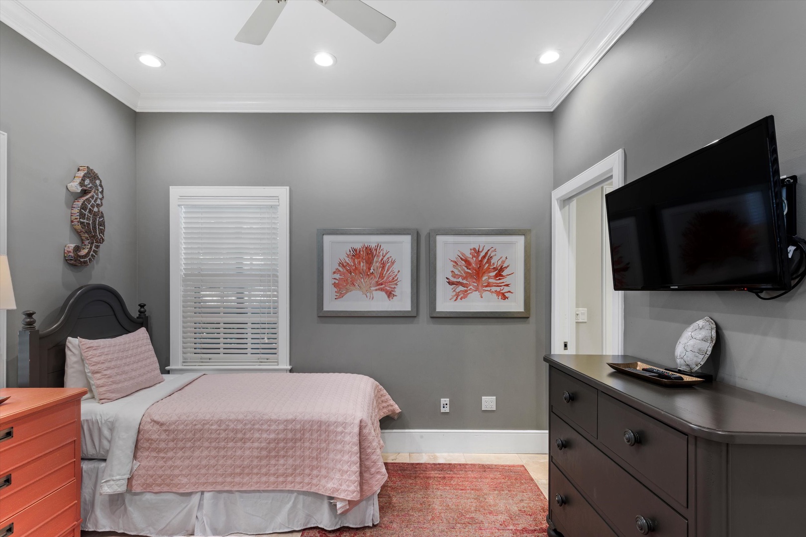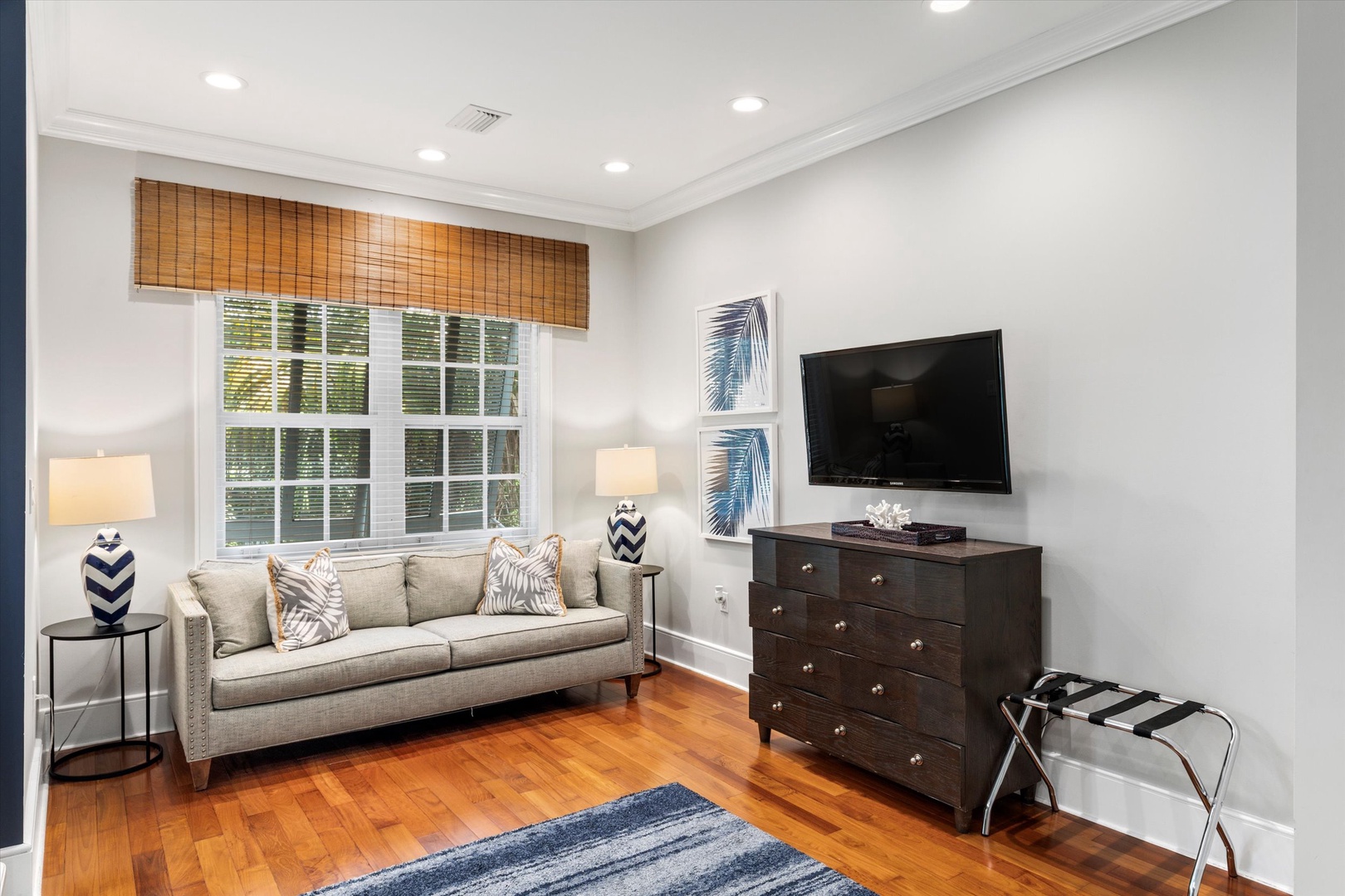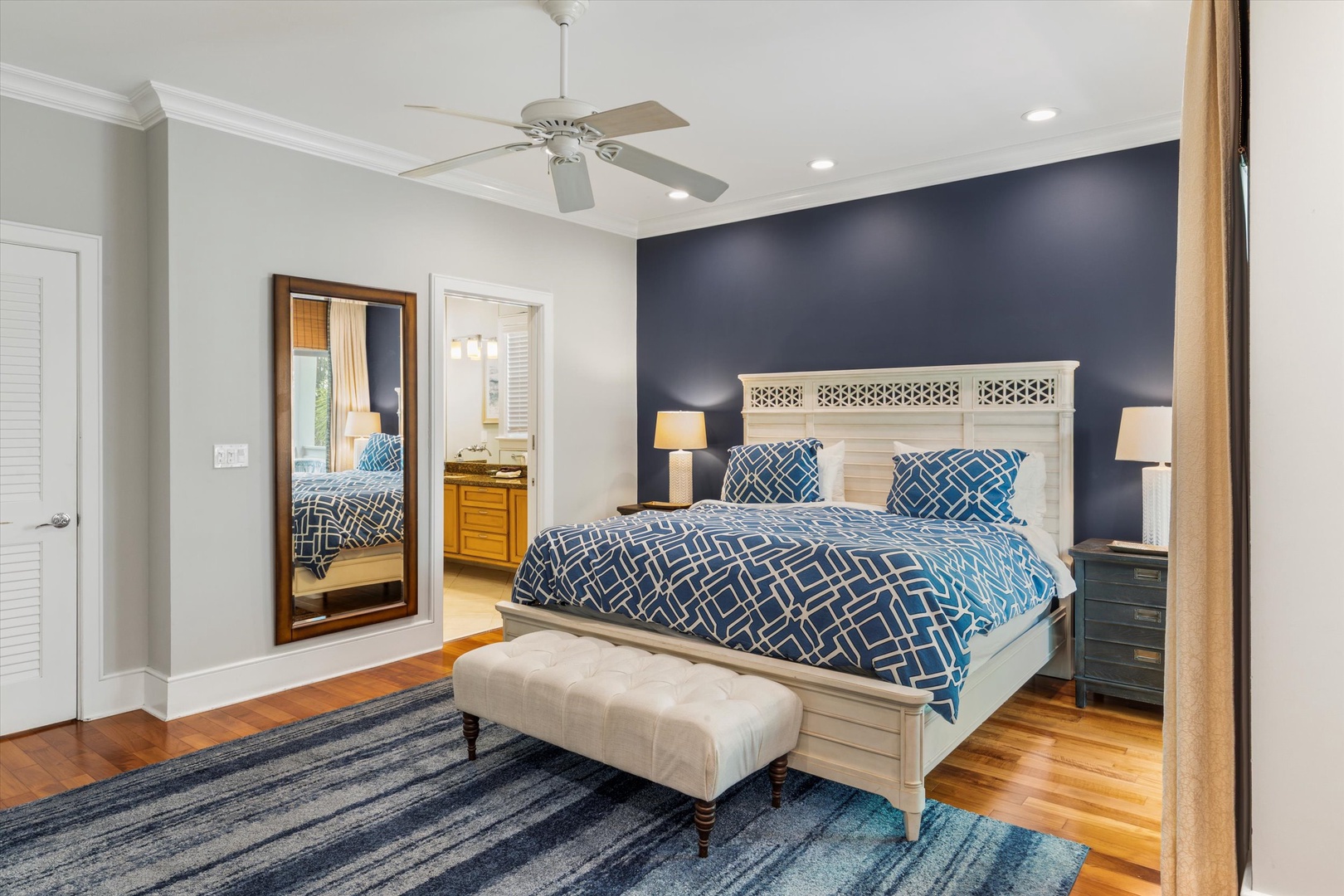 Entering the second floor main bedroom, you will be greeted by a stately king bed and seating area that includes a pull out sofa. The ensuite bathroom is richly appointed with a tiled shower and a dual sink vanity. The additional second floor bedroom includes another king bed and ensuite bathroom with a tub and private balcony. The first floor bedroom contains two twin beds and has a private bathroom with shower. Each bedroom comes with a large flat panel TV and iPhone chargers.